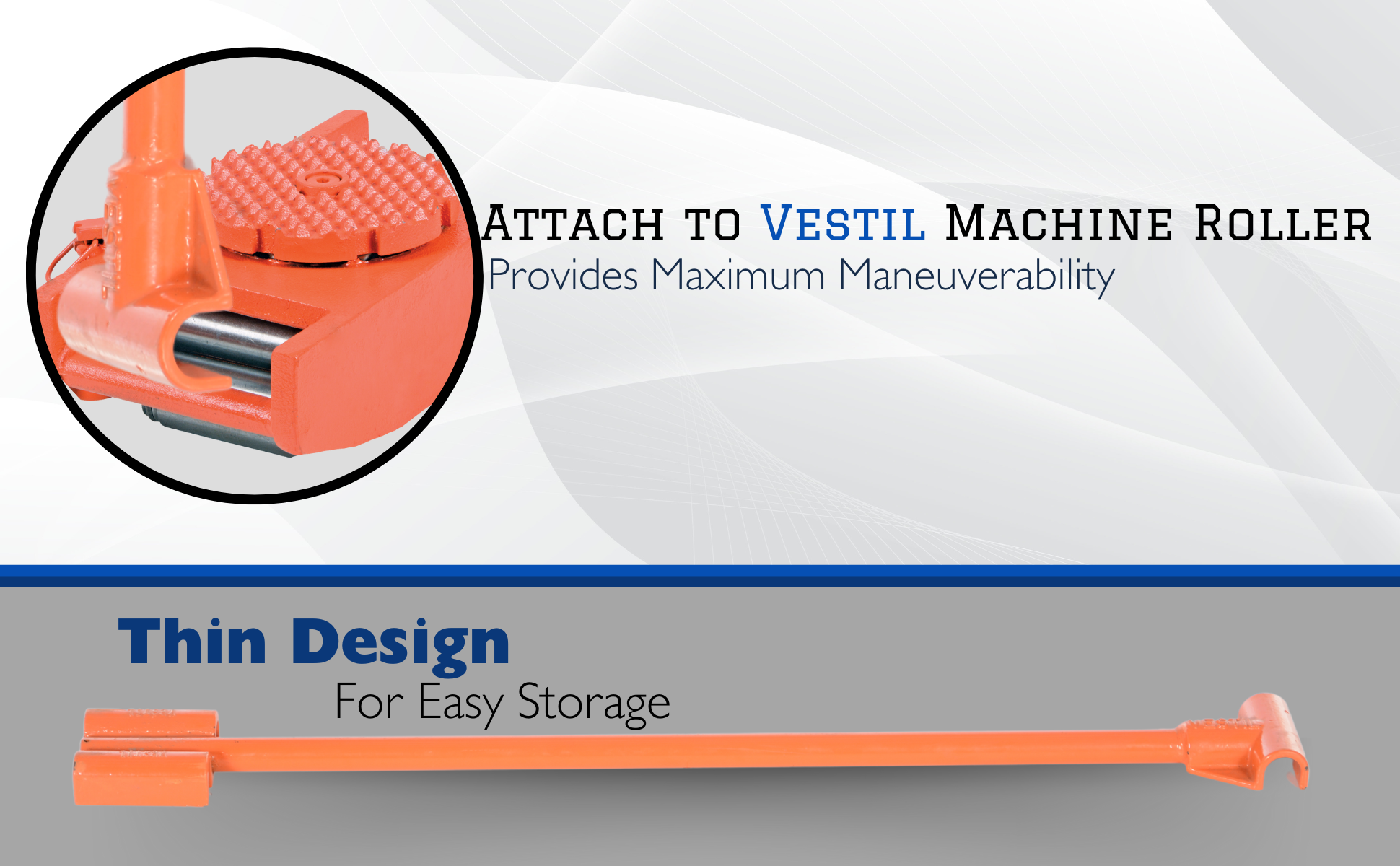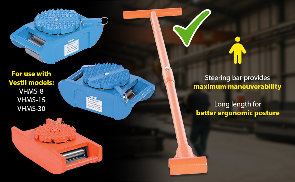 Made of high-strength annealed ductile iron, these Steel Machine Rollers have swivel tops that rotate 360 degrees on chrome steel ball bearings to allow for easier turning. The rollers form a "tank track" to revolve around a center load bearing plate in the frame to provide maximum maneuverability. The weight of the load is transferred directly from the load bearing plate to the rollers, eliminating axle friction and requiring less power to start and move. A spring loaded locking mechanism on the swivel tops, except on model VHMS-2, can be engaged in detents at 45 degrees intervals. These units are virtually maintenance free. Steering bars split in two and connect with sleeve for easy storage.