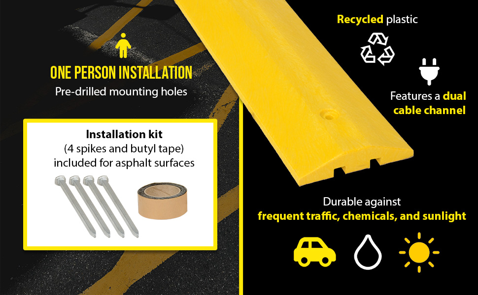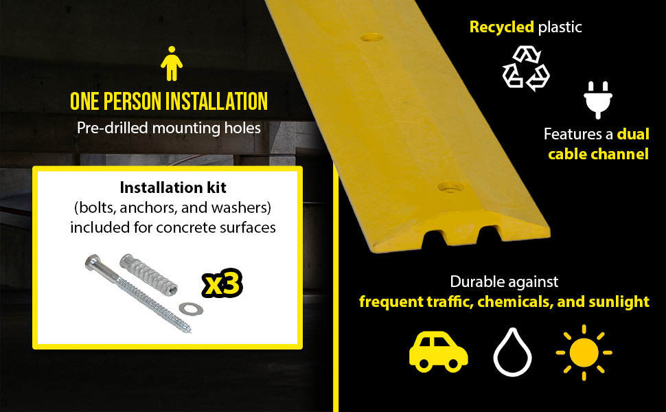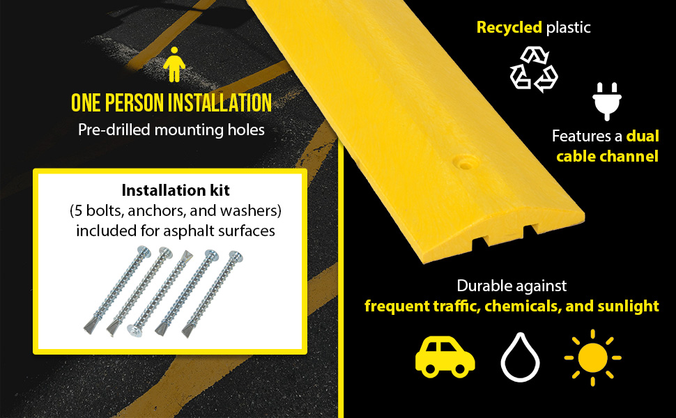 SB-48Help control drivers in dangerous, areas while protecting people and property. One person installation. Can be removed for seal coating, snow removal, or change of location. Resists marring by oil, road salt, sunlight, and chemicals. Feature dual 1"W x 3/4"H cable channels and includes hardware. Constructed of lightweight 100% recycled Low Density Polyethylene (LDPE). Compression strength is 3,200 pounds per square inch. The concrete hardware kit includes bolts, anchors, and washers. Asphalt kit includes spikes and butyl tape. The HD asphalt kit includes anchors and bolts. The HD anchor should be epoxied (epoxy not included) into the ground and then the speed bump is secured to that anchor with a bolt. The glue down anchor plate kit includes anchor plates, T-nuts, bolts, and washers. Requires 2-3 ounces of either 2-part epoxy or heavy duty construction adhesive to the bottom of each anchor plate, which is not included.