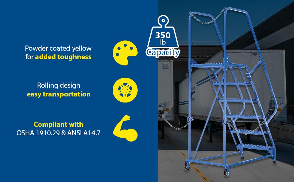 Semi-Trailer Access Ladders are for use getting into Semi-Trailers. Tilt the unit to allow for portability. Units roll on 4" poly-on-poly wheels. Constructed of square tubing framework which handles uniform capacities up to 350 lbs. Features 30" high removable hand railing, access chain, 21" deep top platform, and an industrial baked-in blue powder coat finish for toughness. Each step measures 24" wide by 7" deep and is spaced 10" apart. Climb Angle is 58 degrees.