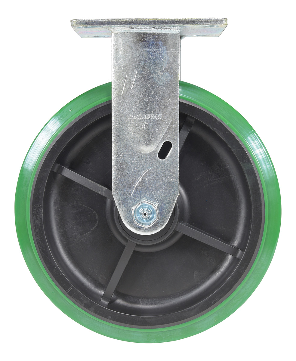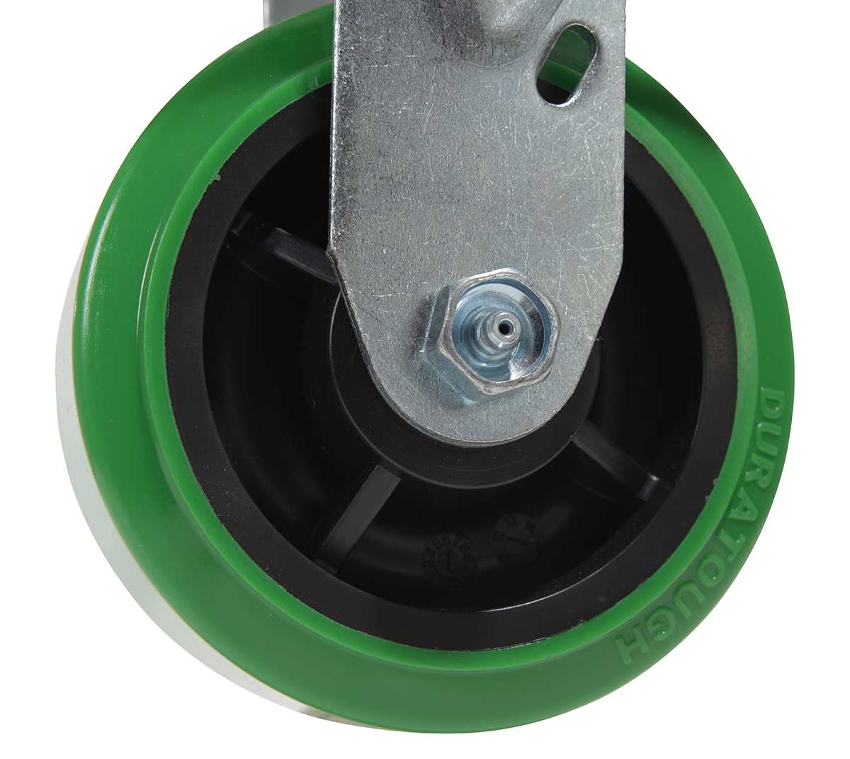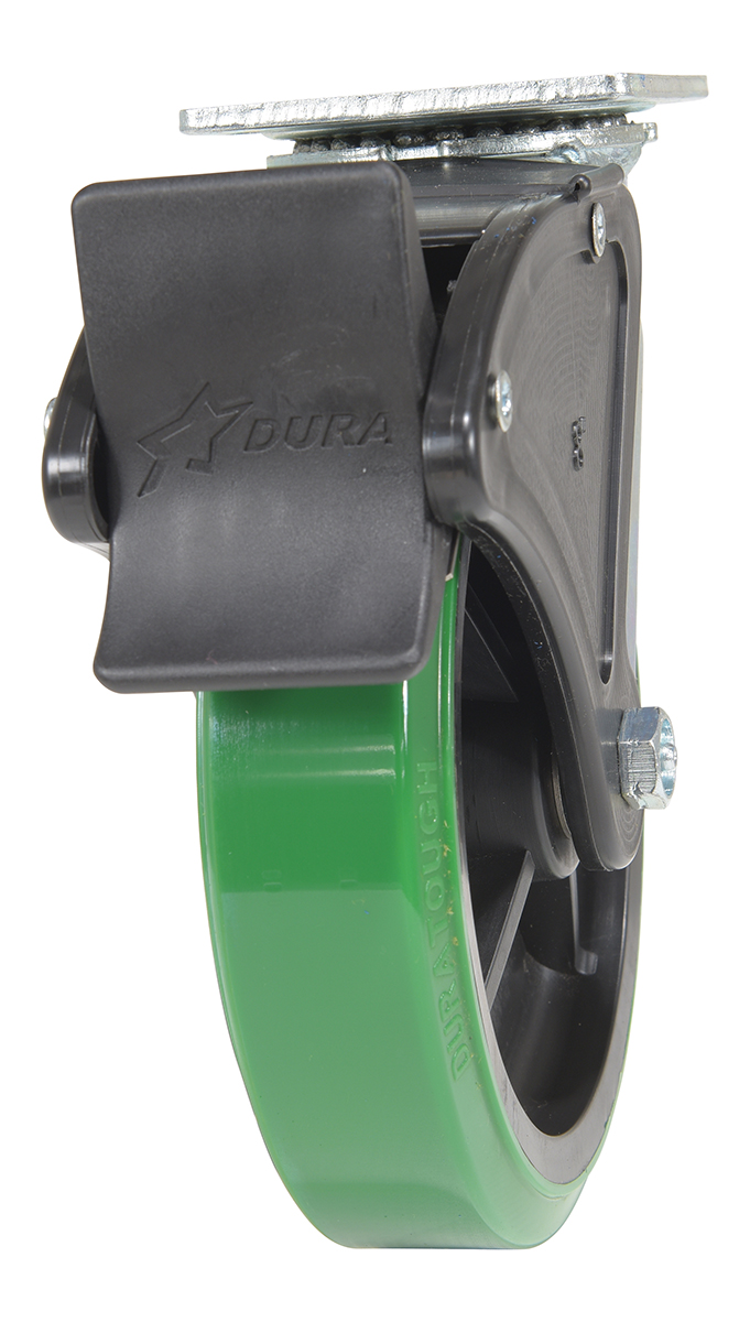 Made with 100% pure polyurethane tread. This caster is a great upgrade for standard polyurethane. Designed using a new liquid cast flow fusion that ensures a 100% mechanical bond to core and "zero" trapped air. It has a high resistance to debris and most chemicals. The proprietary tread provides good floor preservation, and has a longer life performance than standard polyurethanes. Green tread color. 90-95 shore a. Wheel center is constructed of polyolefin.