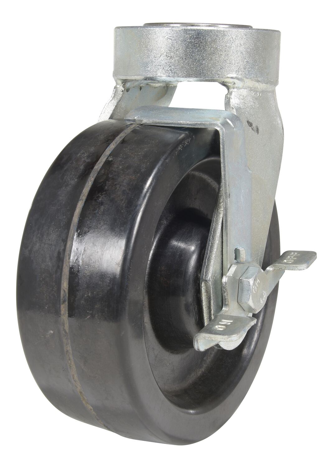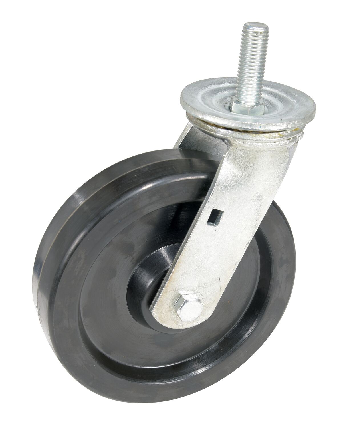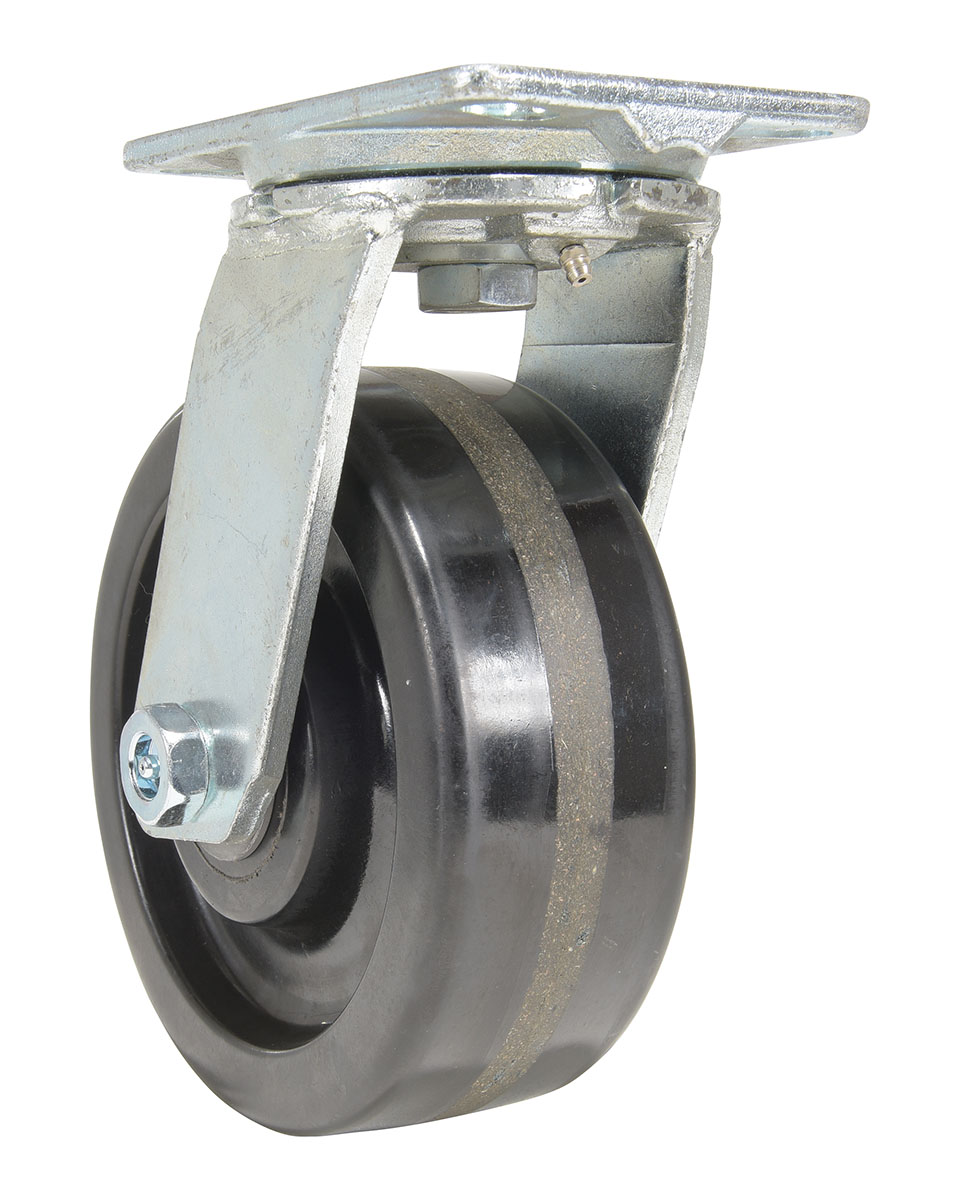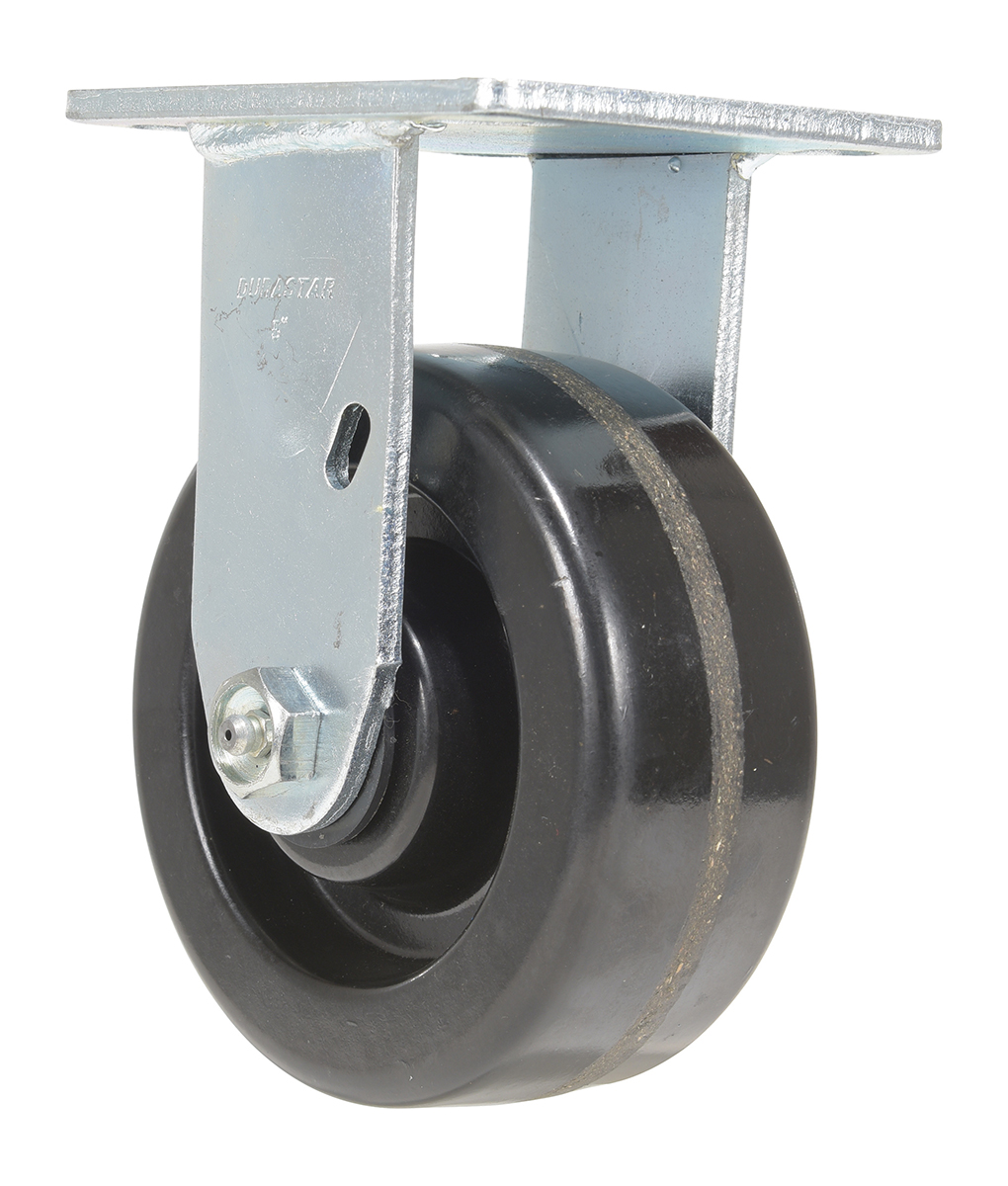 Phenolic wheels have a high resistance to impact damage, while providing protection for floors in commercial and industrial settings. Resistant to water, oil, and grease. It is also spark resistant and operates in a wide temperature range. Black tread color. Wheel core is phenolic. 100 Shore A.