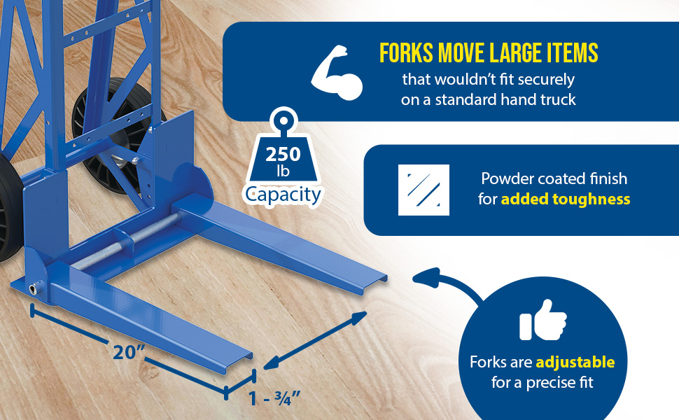 A standard hand truck isn't enough? Time to upgrade to a hand truck with forks. Forks allow the user to gather and maneuver large items that wouldn't fit securely on a standard hand truck. The forks are adjustable for a more precise fit, depending on the size of the product being transported. When not in use, the forks fold vertically into the body of the unit for more compact storage. Large wheels absorb shock when traversing over uneven or rough surfaces. Powder coated finish for added toughness.