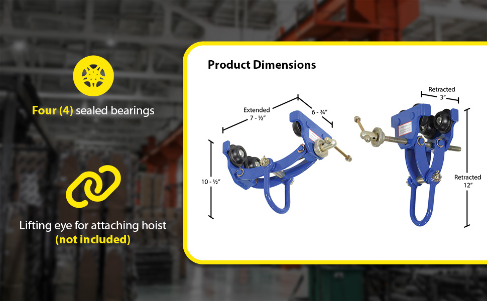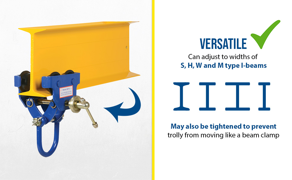 QIT-06These trollies are dependable, easy and safe to use. Designed to easily adjust to the width of virtually any S, H, W and M type I-beam. Width is adjusted with manual screw mechanism. Includes locking ring to prevent trolley width from changing accidentally. Manual screw mechanism may also be tightened to prevent trolley from moving (similar to a Beam Clamp). Each trolley includes four rollers with sealed bearings for long life. A lifting eye is located at the bottom of the trolley for attaching to a hoist (hoist sold separately). Steel construction and painted finish.