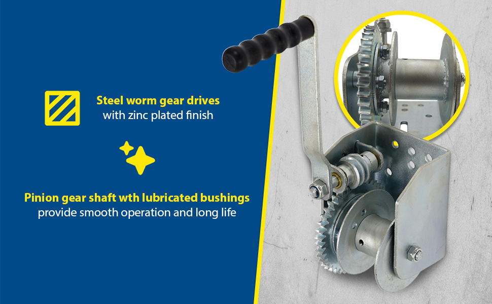 Wall Mounted Hand Winches Pulling devices that use a wire, rope or cable to move heavy loads. Constructed of steel worm gear drives with zinc plated finish. Pinion gear shaft with lubricated down bushings provide smooth operation and long life.