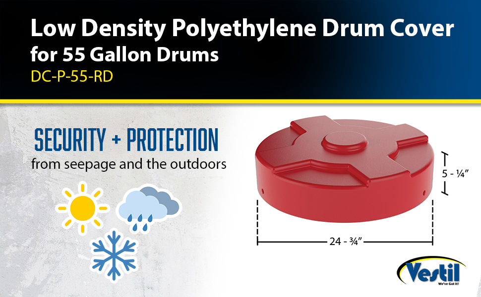 DC-P-55-UF-RD DC-P-55-UF-RDLow Density Polyethylene Drum Cover 55 Gallon Universal Fit RedOverall Diameter (in.): 24-5/8