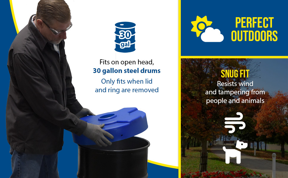 Collecting aluminum cans or plastic bottles could not be easier with Recycling Lids. Fits on open head plastic or steel drums only with lid and ring are removed. Low-density polyethylene construction. Fits snug to resist blowing off in outdoor environments or being tampered with by people or animals. CANF models have a flap to help discourage the removal of contents.