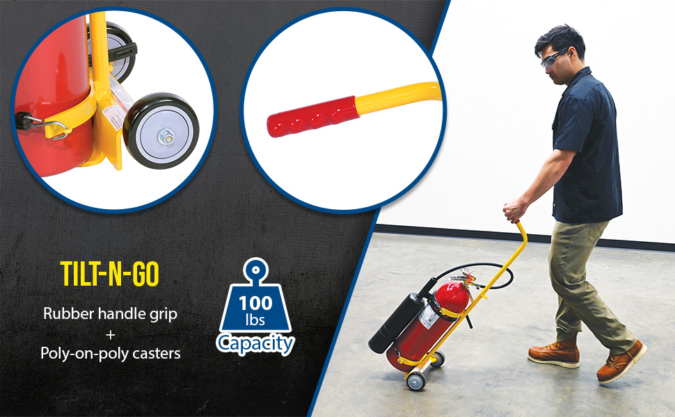 The Fire Extinguisher Carrier, model FEC-1, is designed for easily transporting your fire extinguisher up to 8" in diameter. Includes two (2) heavy duty adjustable rubber straps. Sturdy handle with rubber grip and poly casters for tilt-n-go portability. Welded steel construction with yellow baked-in powder-coat toughness. 4" x 2" stabilizing plate keeps unit upright when empty and helps retain extinguisher. Adjustable EPDM restraining straps keep extinguisher secure and allow for quick access. Wall mount bracket included to store the extinguisher off the floor.