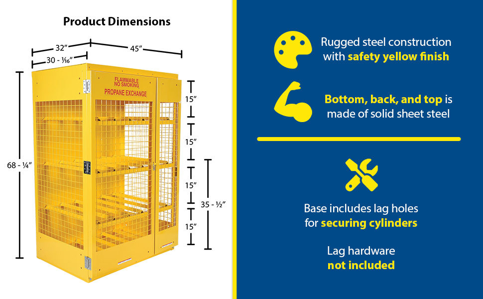 Steel cabinets for storage of cylinders. Cylinder storage capacity is based on cylinder size. Sides are made of expanded steel for an open view design. The top, back, and bottom is made of solid sheet steel. Lockable doors protect cylinders (padlock not included). Base includes lag holes for securing cylinders. Vertical units include chains for securing cylinders. Includes red lettered signage noting "Flammable-No Smoking" contents. Meets OSHA 1910.110 (f)(6)(ii), ANSI NFPA 55 + 58 and CGA P-1 design standards. Rugged steel construction with a baked-in powder coated safety yellow finish for toughness.