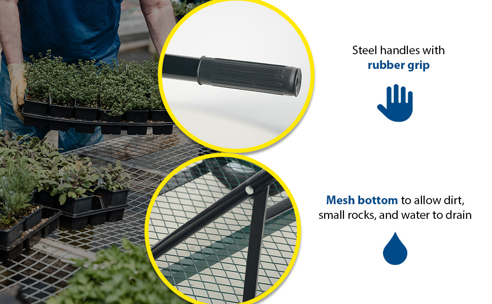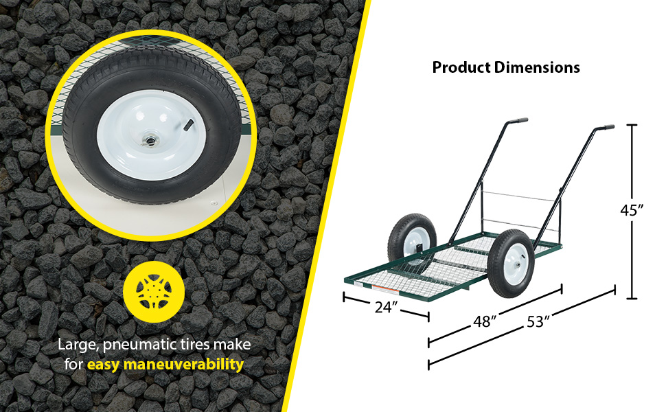 Transport plants, flowers, trees, shrubs, rocks, and similar materials or parts with our full line of Landscape Carts. These carts are rugged and easy to maneuver with their large pneumatic tires. All carts have mesh sides and bottoms to allow dirt, small rocks, and water to drain through. Steel construction. All carts ship knockdown. Assembly required.
