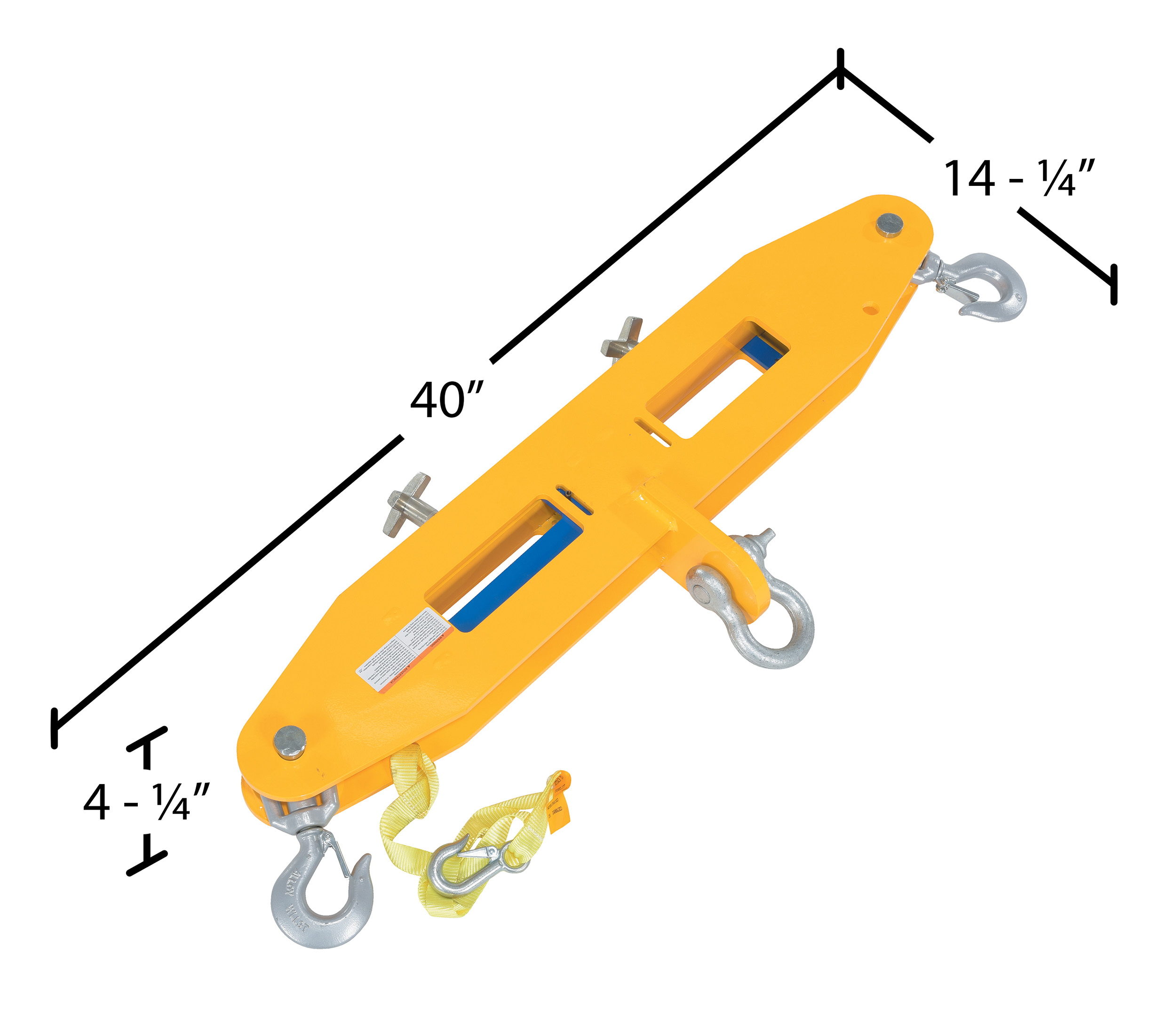 Steel Forklift Lifting Beam 40 In. x 4-1/4 In. x 14-1/4 In. 4,000 Lb. Capacity YellowA forklift lifting beam is the perfect asset for maneuvering and transferring heavy objects. The centrally located hook between two fork pockets allow the user to safely attach to the unit and transport to the desired location. Hooks are also attached to the outside of the unit for a more secure lifting experience. The strong steel construction with a bright finish enables high visibility from both near and far. Secure to the fork truck by means of a 48" long safety restraint and screw clamps.