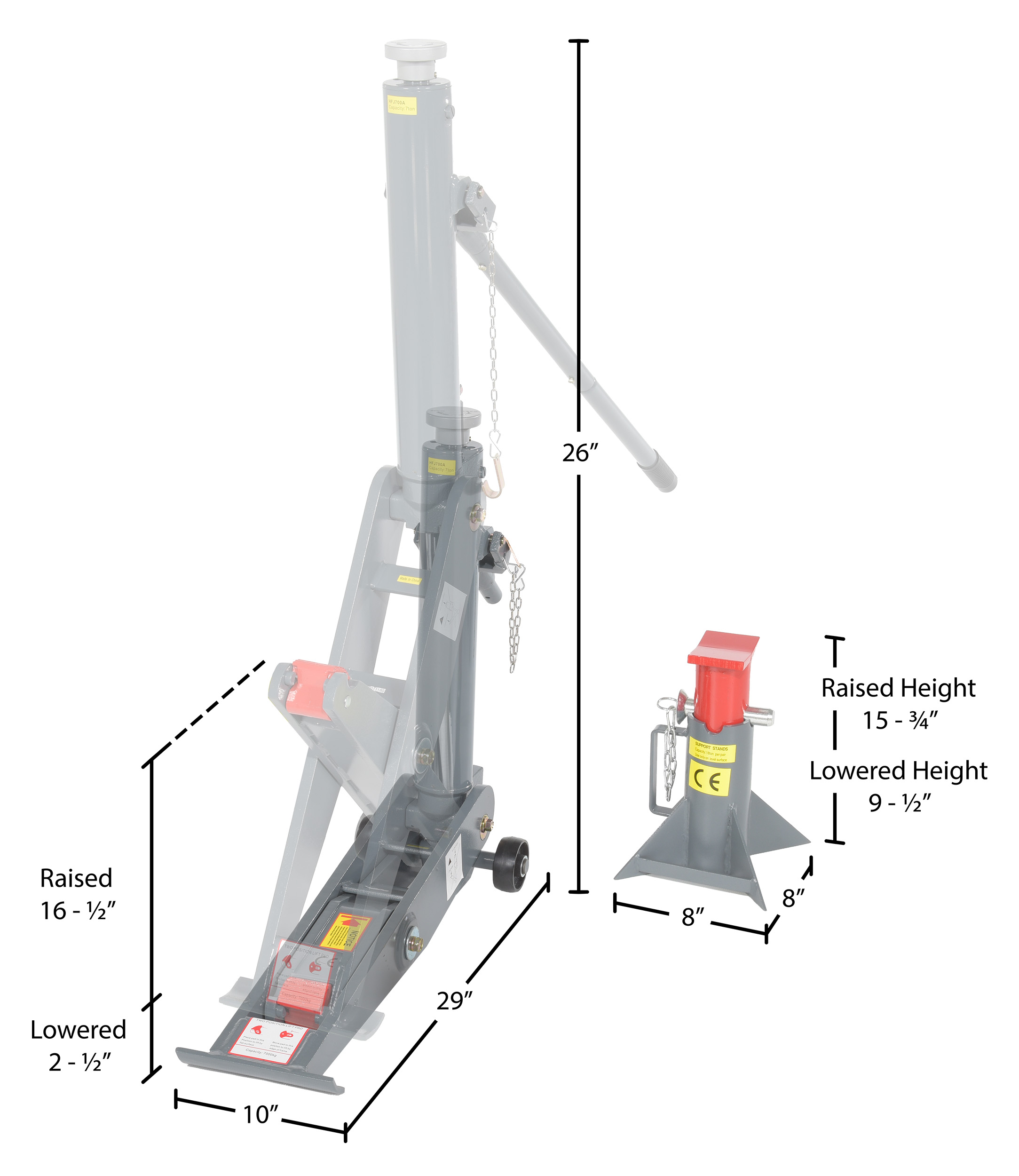 Steel Manual Hydraulic Fork Truck Jack 29 In. x 10 In. x 26 In. 15,000 Lb. Capacity GrayManual Hydraulic Fork Truck jack; designed to raise your fork trucks and other heavy equipment. Strong construction features high-quality rugged steel. With a hand pump lever to lift and lower, the maximum lifting range provides ample room needed to perform a variety of repairs. The removable handle and compact size makes the unit simple to transport. Powder coated gray for a baked in finish for added toughness.