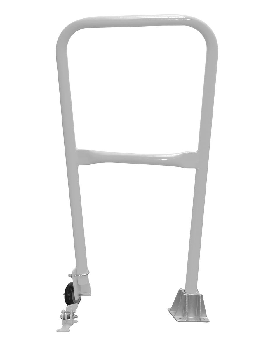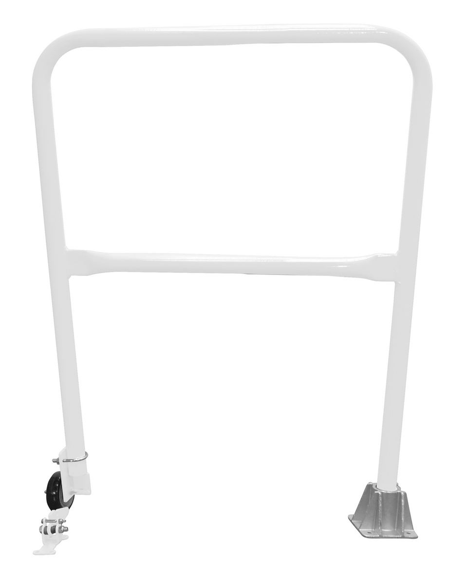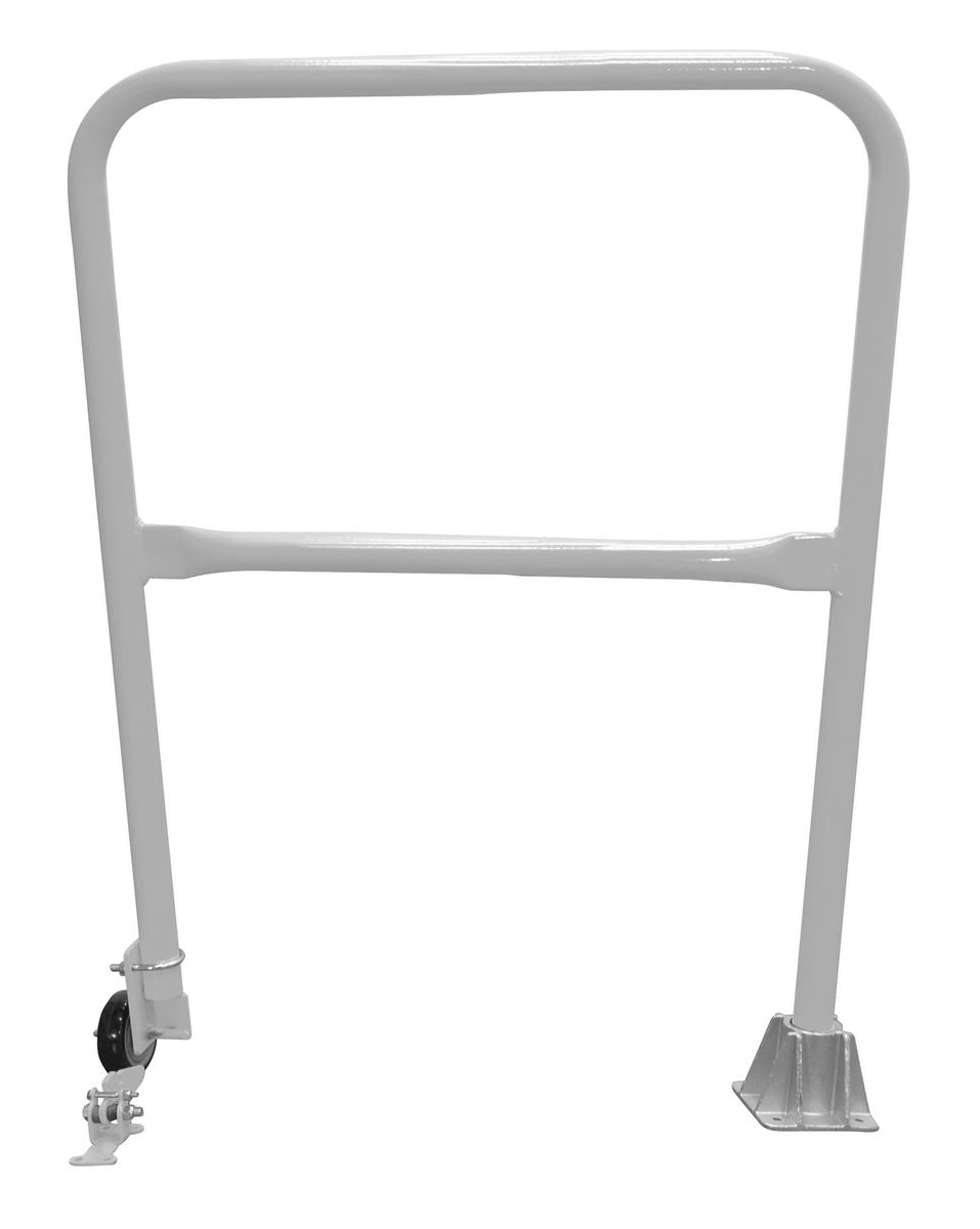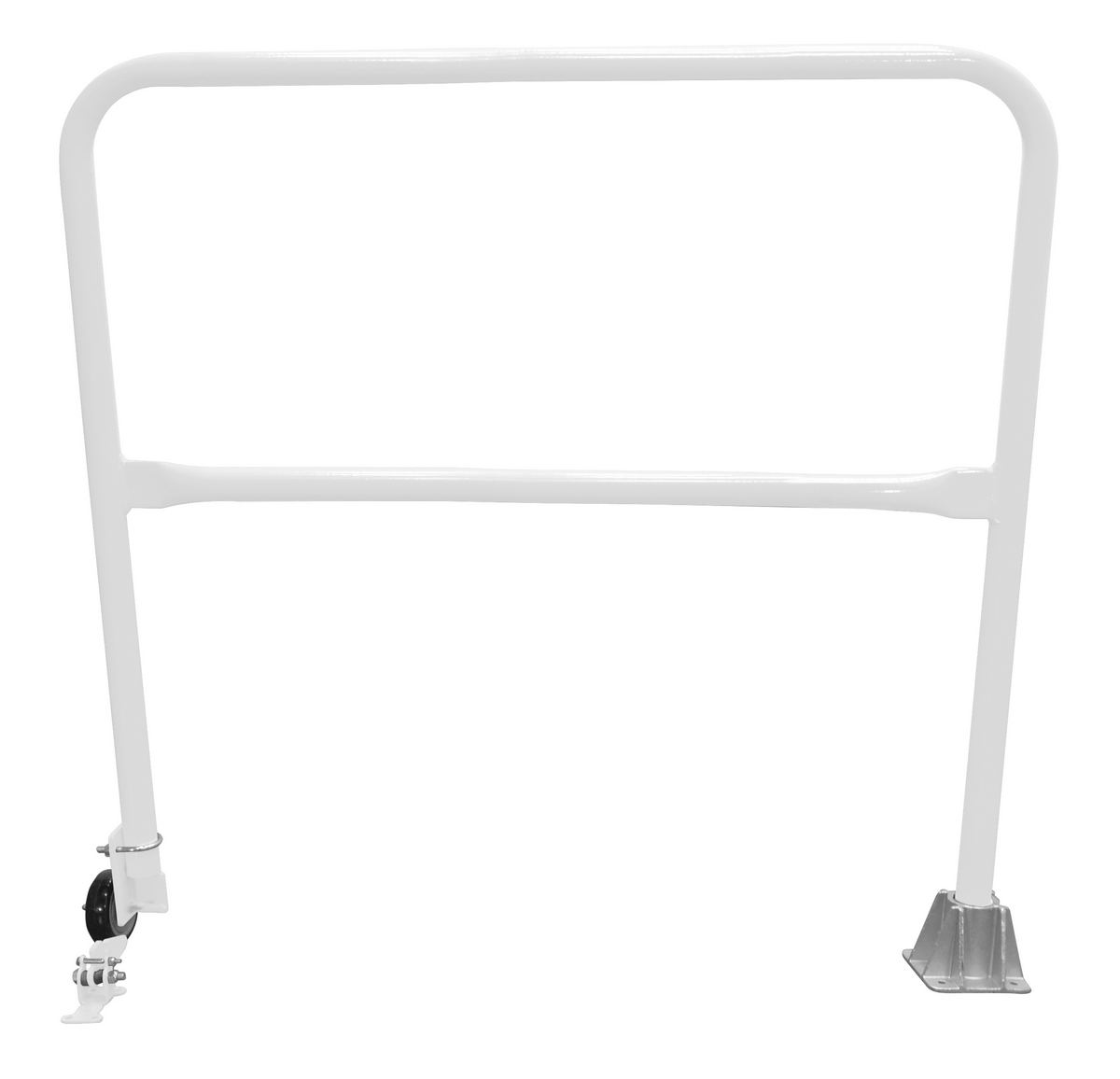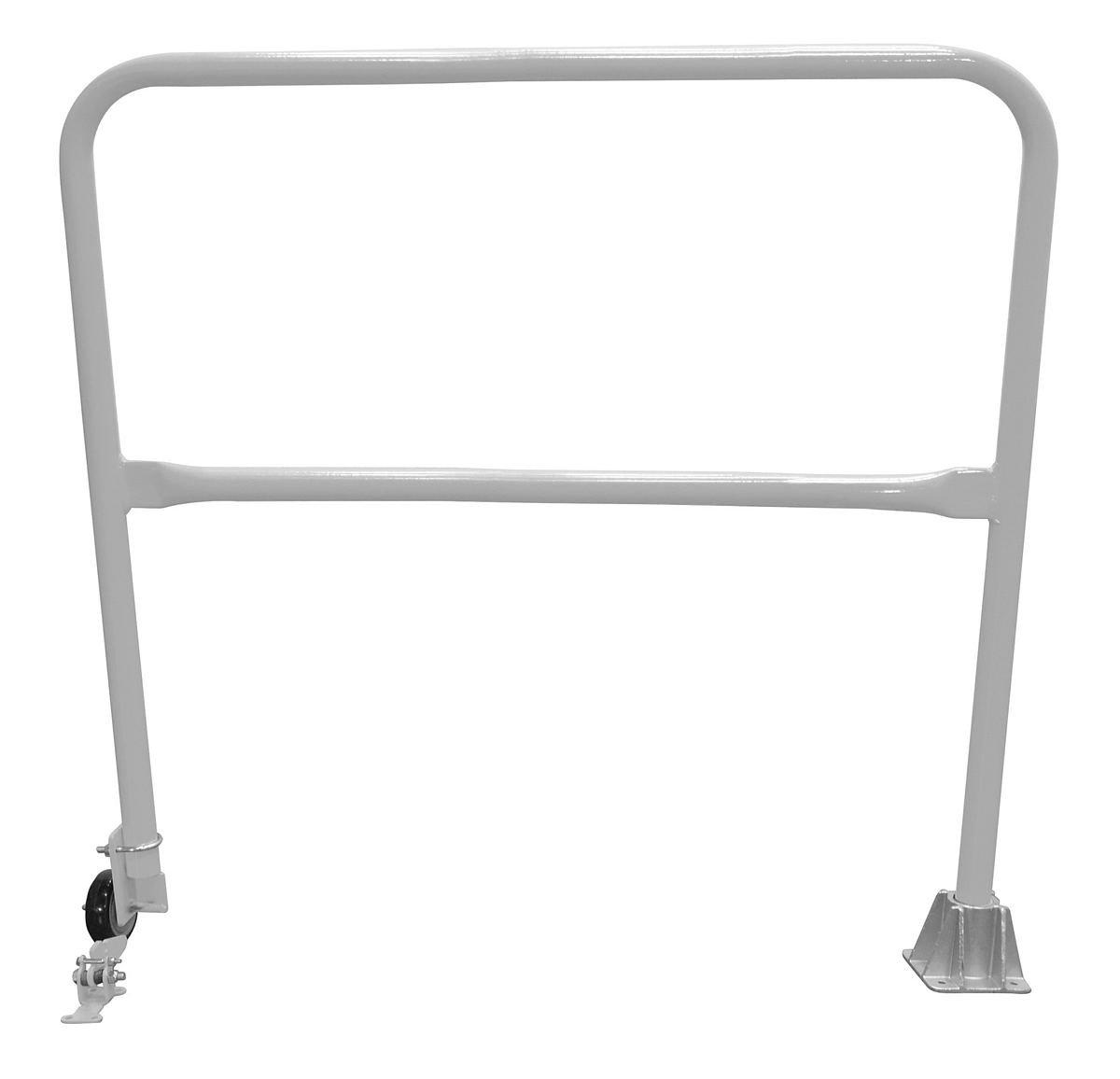 Economical Safety Swing Gates are an economical way to protect people from dock falls. Durable railings are constructed from schedule 10 pipe (1-5/8" O.D.). Units have a top rail height of 46-1/4" and a 25" mid-rail. 4" poly-on-poly wheel allows units to be swung out of the way. Cast single socket is included.