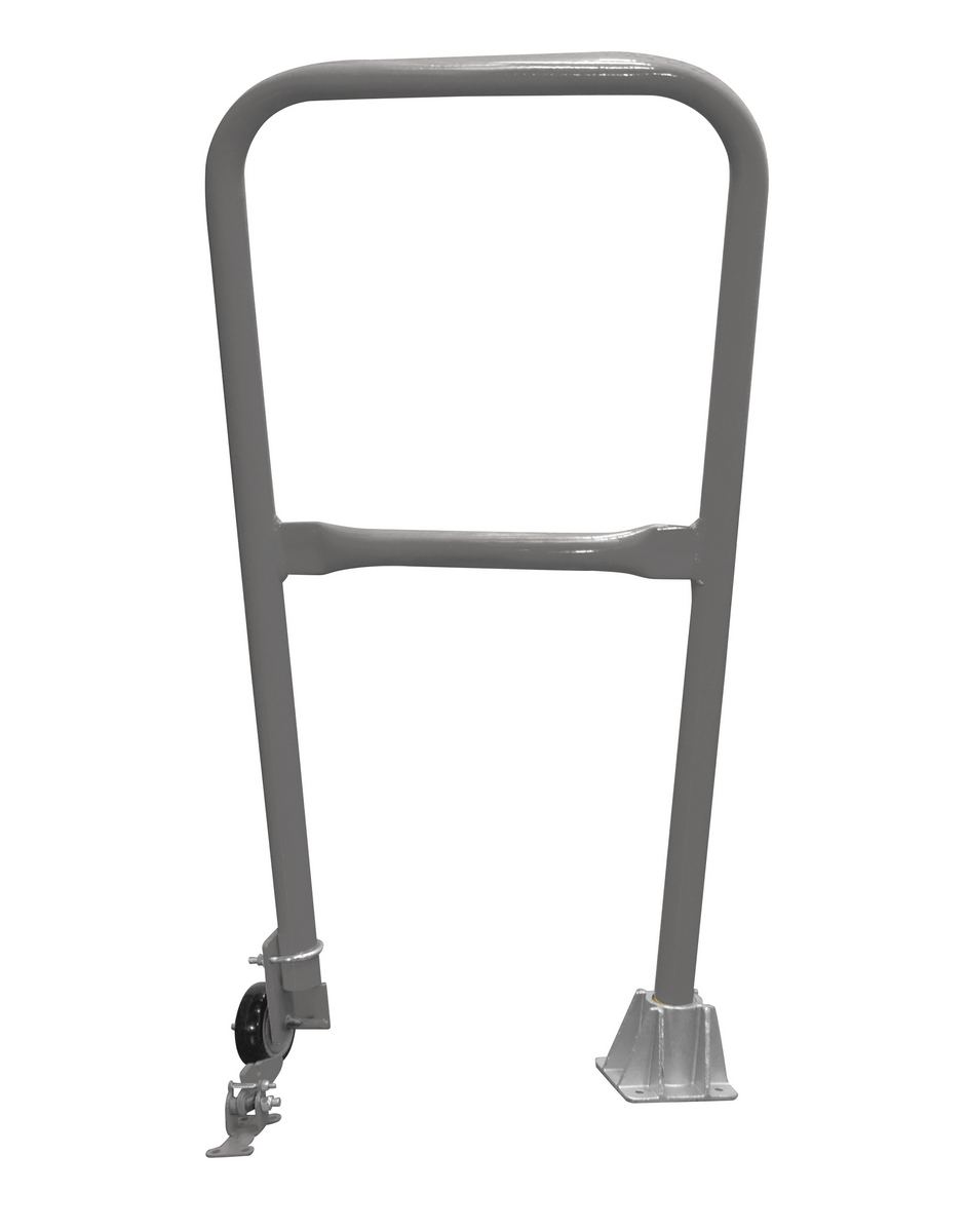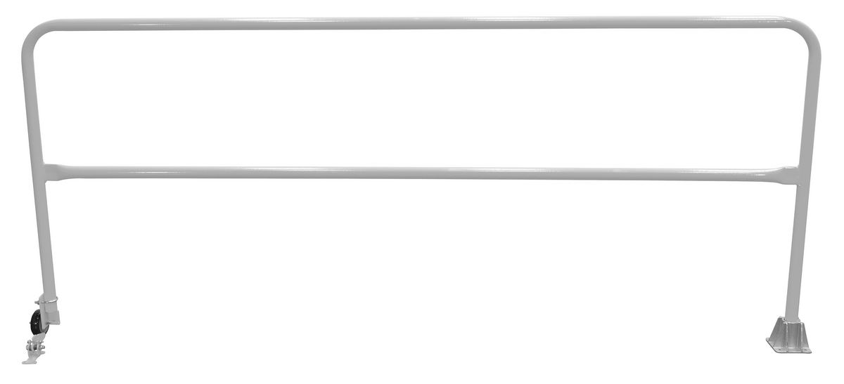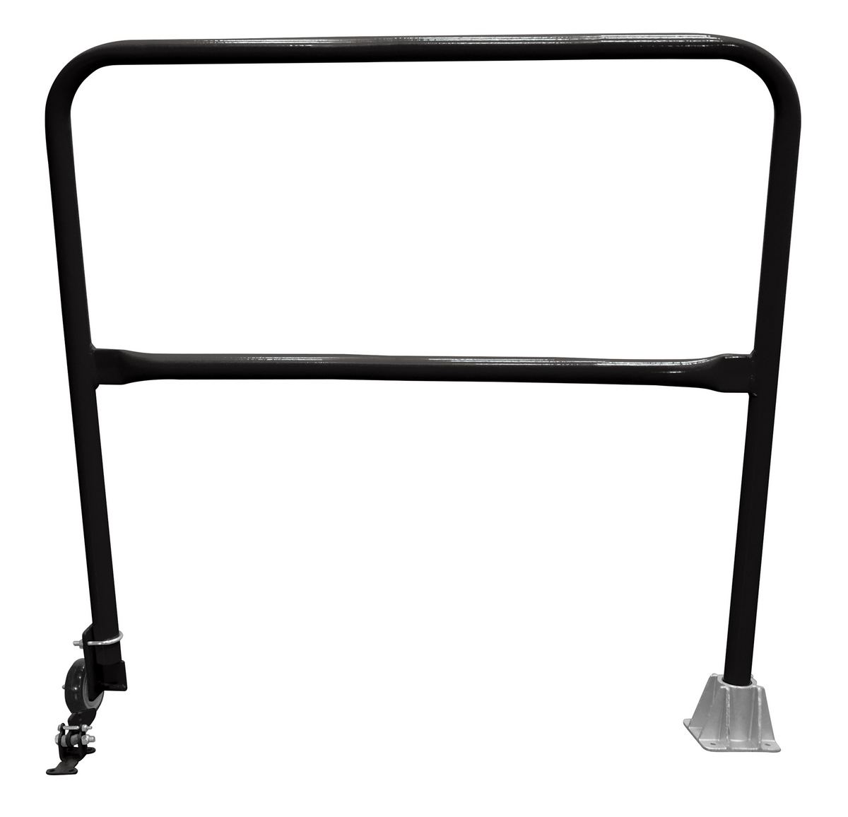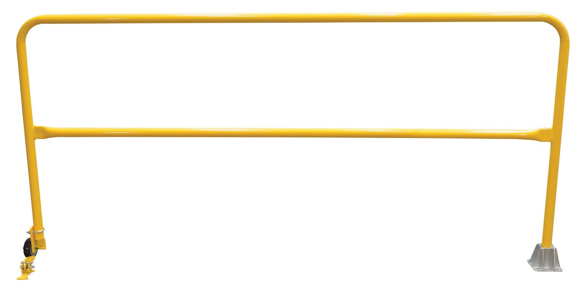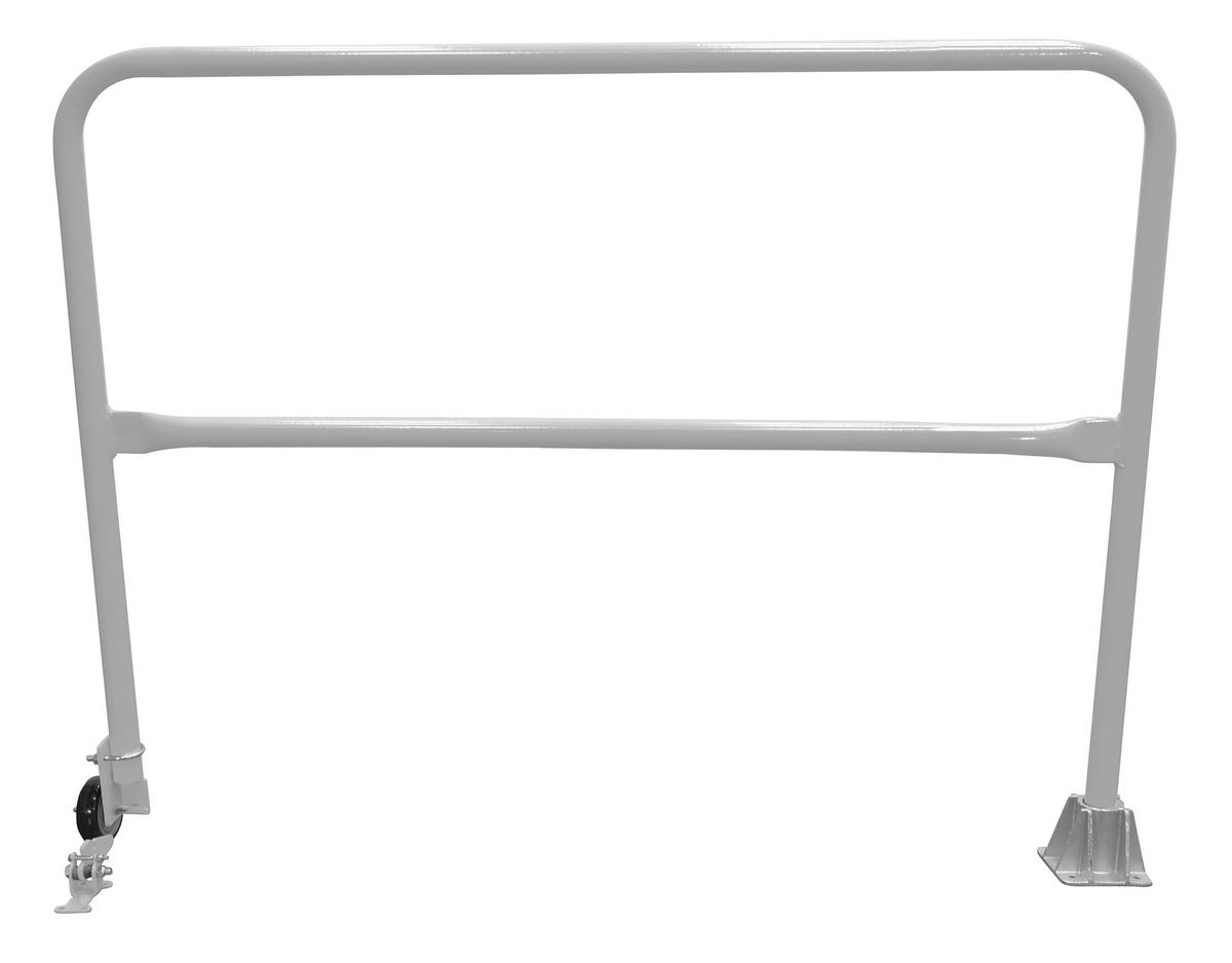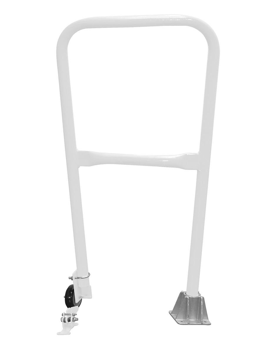 Economical Safety Swing Gates are an economical way to protect people from dock falls. Durable railings are constructed from schedule 10 pipe (1-5/8" O.D.). Units have a top rail height of 46-1/4" and a 25" mid-rail. 4" poly-on-poly wheel allows units to be swung out of the way. Cast single socket is included.