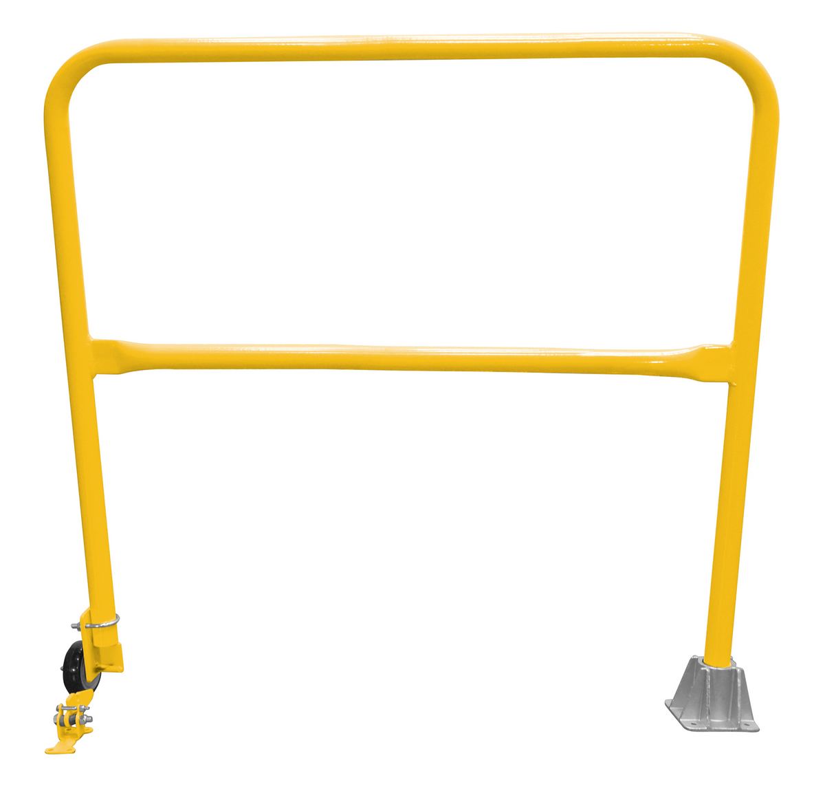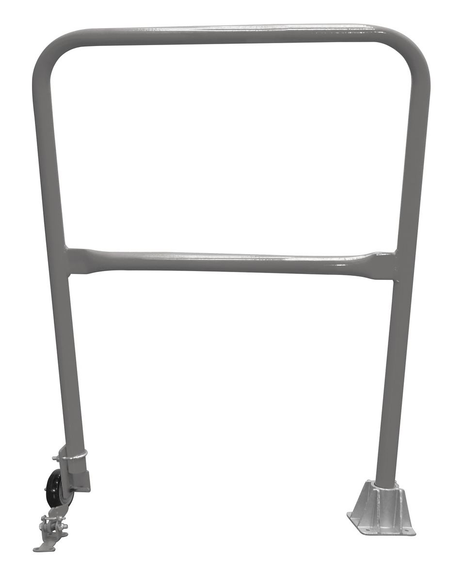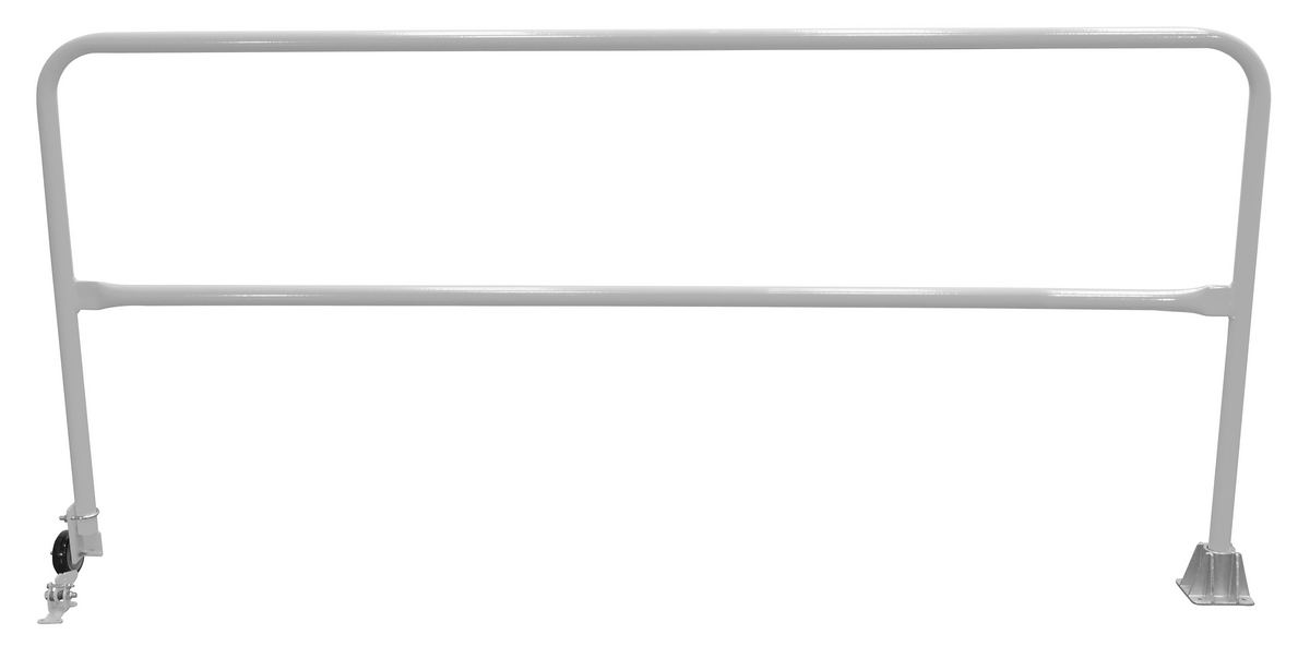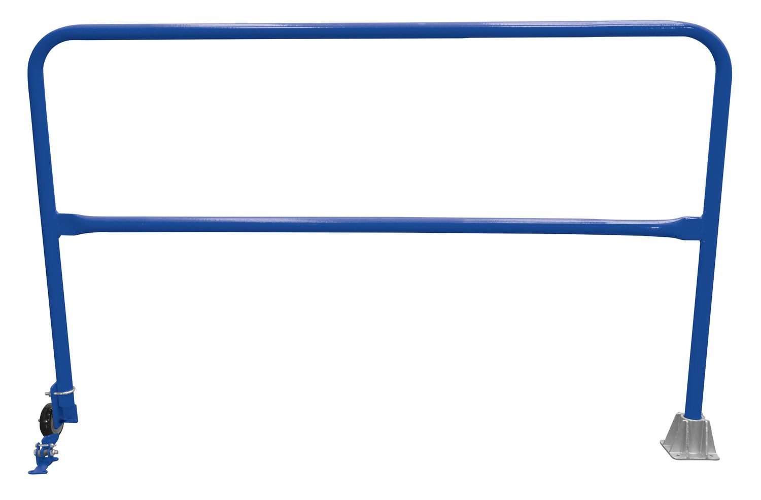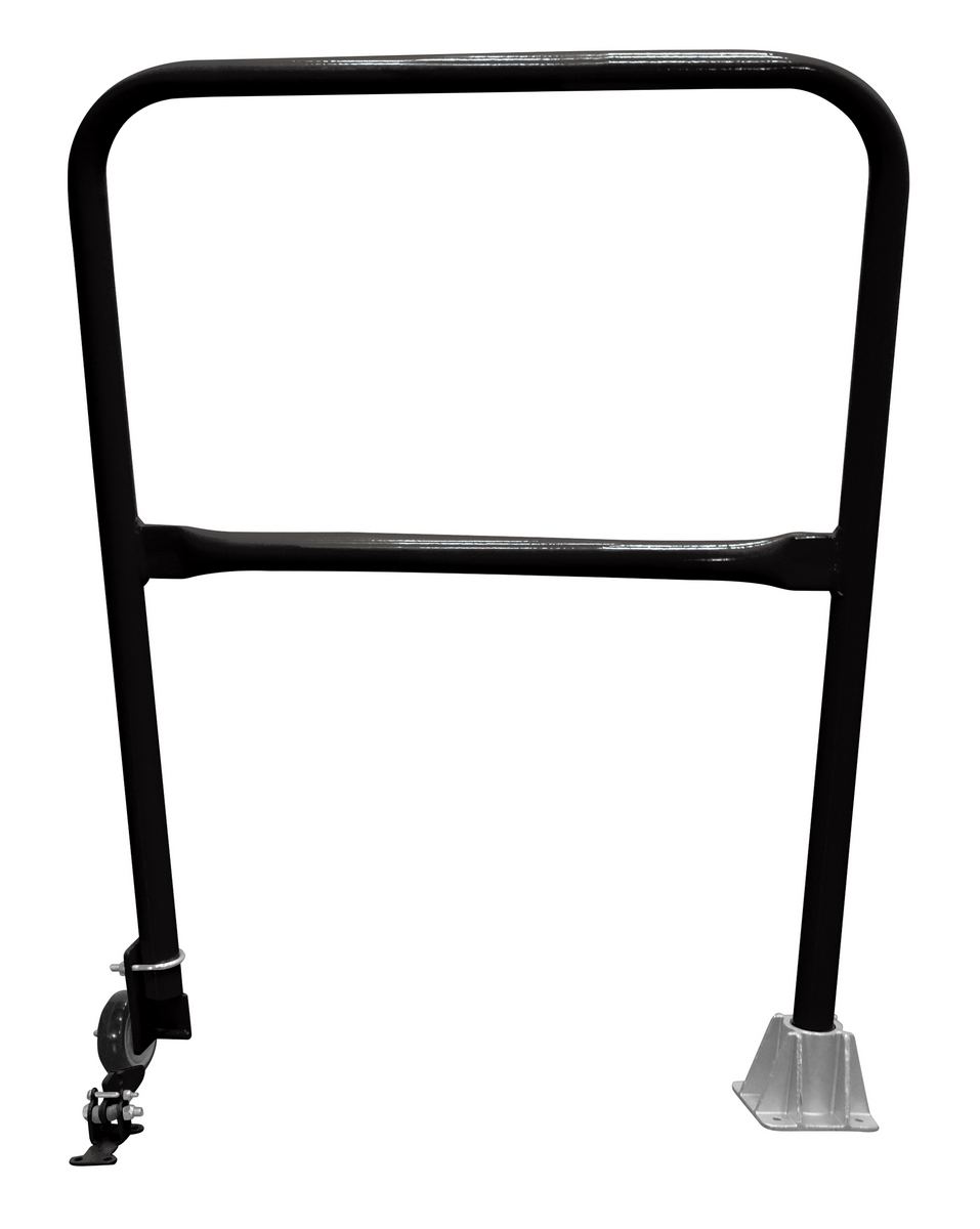 Economical Safety Swing Gates are an economical way to protect people from dock falls. Durable railings are constructed from schedule 10 pipe (1-5/8" O.D.). Units have a top rail height of 46-1/4" and a 25" mid-rail. 4" poly-on-poly wheel allows units to be swung out of the way. Cast single socket is included.