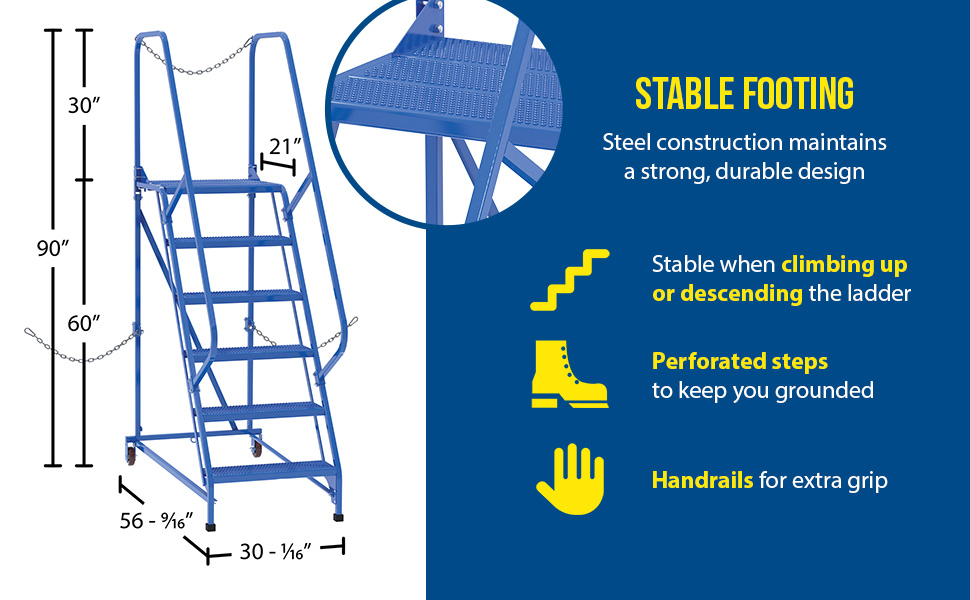 Semi-Trailer Access Ladders are for use getting into Semi-Trailers. Tilt the unit to allow for portability. Units roll on 4" poly-on-poly wheels. Constructed of square tubing framework which handles uniform capacities up to 350 lbs. Features 30" high removable hand railing, access chain, 21" deep top platform, and an industrial baked-in blue powder coat finish for toughness. Each step measures 24" wide by 7" deep and is spaced 10" apart. Climb Angle is 58 degrees.