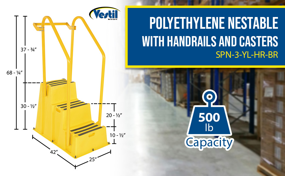 SPN-3-YL-HR-PO SPN-3-YL-HR-POPolyethylene Nestable with Handrails Casters 3 Step 500 Lb. Capacity YellowUniform Capacity (lb.): 500