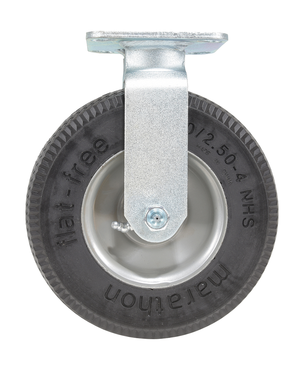 The foam-filled caster provides the same shock absorbent cushion ride a pneumatic does without the worry of flat tires and refilling air. Ideal for outdoor applications.