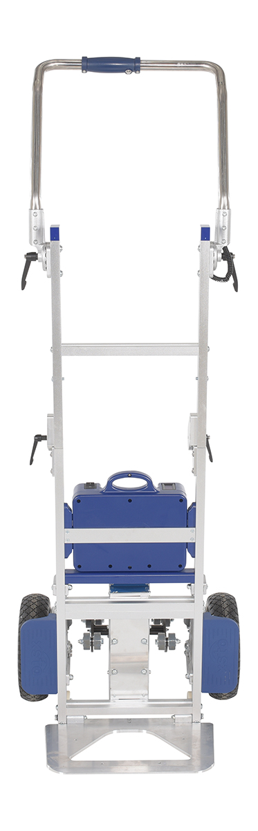 When objects are required to be moved up or down flights of stairs, the powered stair climber is the perfect asset. With the large ergonomic handle and tall upright aluminum alloy structure, a single user can transport goods with ease. A wide platform base gives the user the opportunity to transfer a variety of items whether they are heavy, light, large or small. When transferring goods down a set if stairs, the brake is automatically applied to ensure safety and consistent speed of movement. The powered design increases user safety and minimizes the labor associated with moving awkward items. This powered stair climber has two raise/lowering speeds. When not in use, the cart folds into a very compact design that is perfect for transporting in vehicles or storing away in closets. Large polyurethane wheel make traversing over a variety of surfaces as simple as can be.