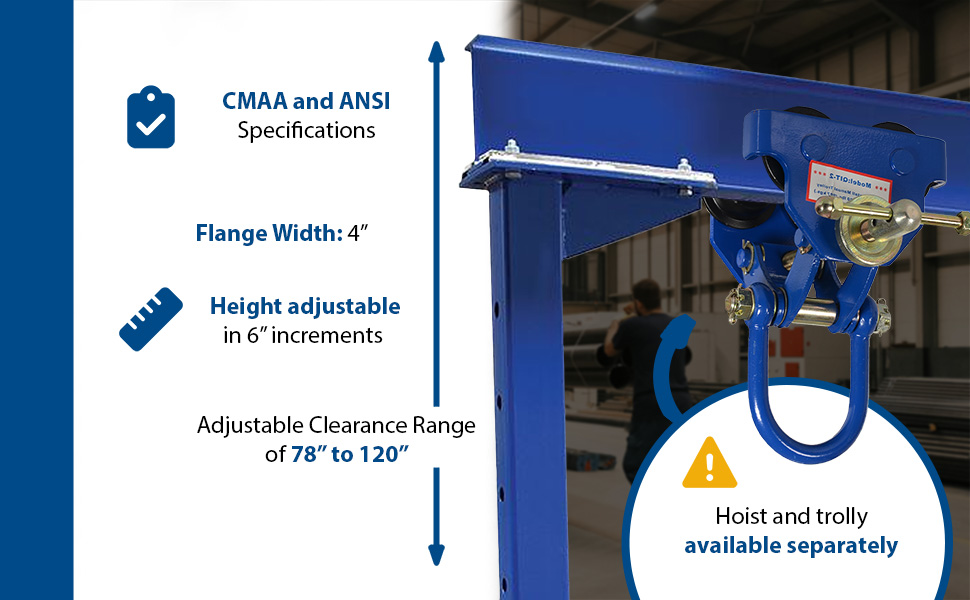 | Steel Knock-Down Adjustable Height Gantry Crane with V-Groove Ductile Steel Casters 10 Ft. Wide x 14 Ft. Max Usable Height 4,000 Lb. Capacity Blue | Uniform Capacity (lb.): 4,000 Adjustable Clearance Range (in.): 102 to 168 | 834 |