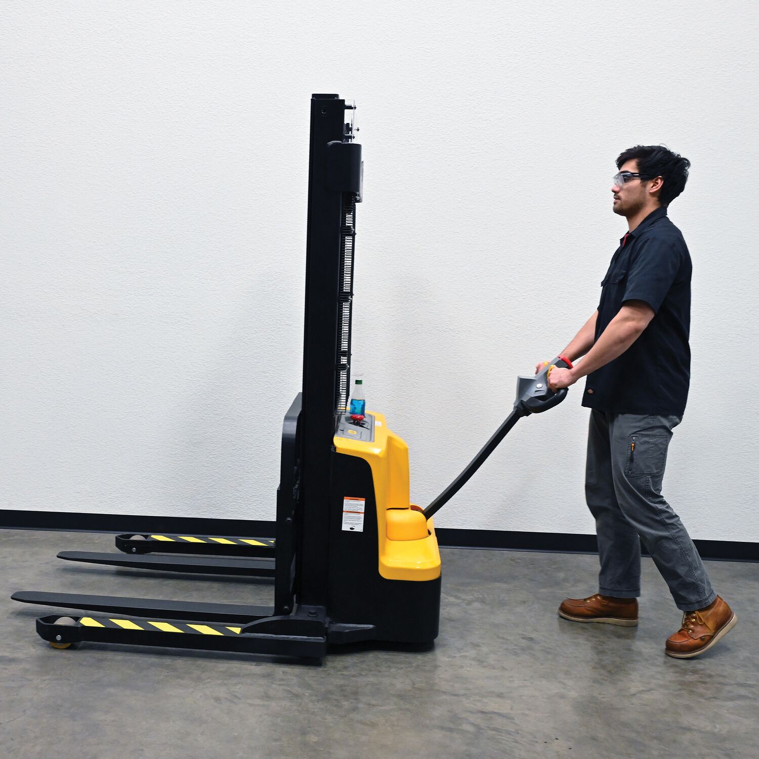 The double mast fully powered electric stacker transports loads throughout warehouse facilities quickly and with less effort. High torque drive and lift motor handles heavy duty jobs. Ergonomic handle features lift/lower controls, proprietary safety enhancing emergency reverse function, and horn. The unit includes an electromagnetic disc brake with automatic dead-man feature. Powered lifter has two 12V lead acid deep cycle batteries, integral battery charger, and a battery level gauge.