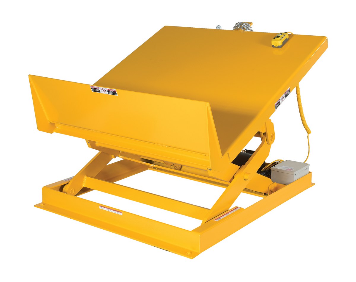 The lift & tilt workstation table allows platform to lift & tilt at the same time for easy operation. Maximum tilt angle is 44 degrees for better ergonomics and operator safety. Service height range is 10" to 24" (to lowest point of platform surface). The platform end includes a high full width lip to support containers. The internal power unit includes electric motor, hydraulic pump, and control box. It includes a two-button hand held pendent control with optional voltages available. The welded steel construction has a yellow painted finish. Foot control available, model FC-2.