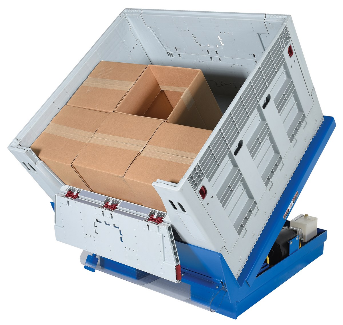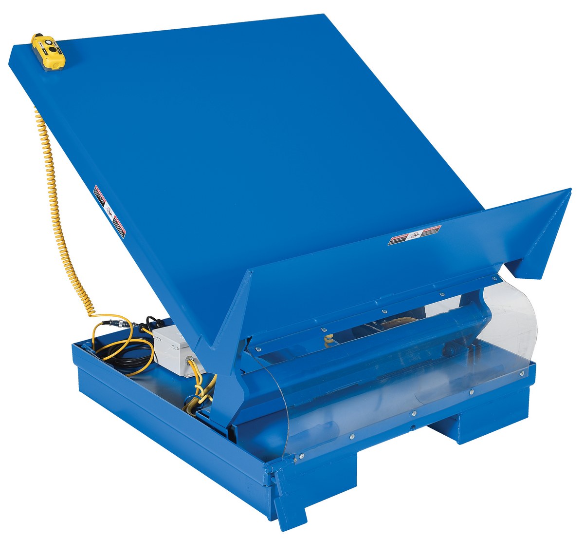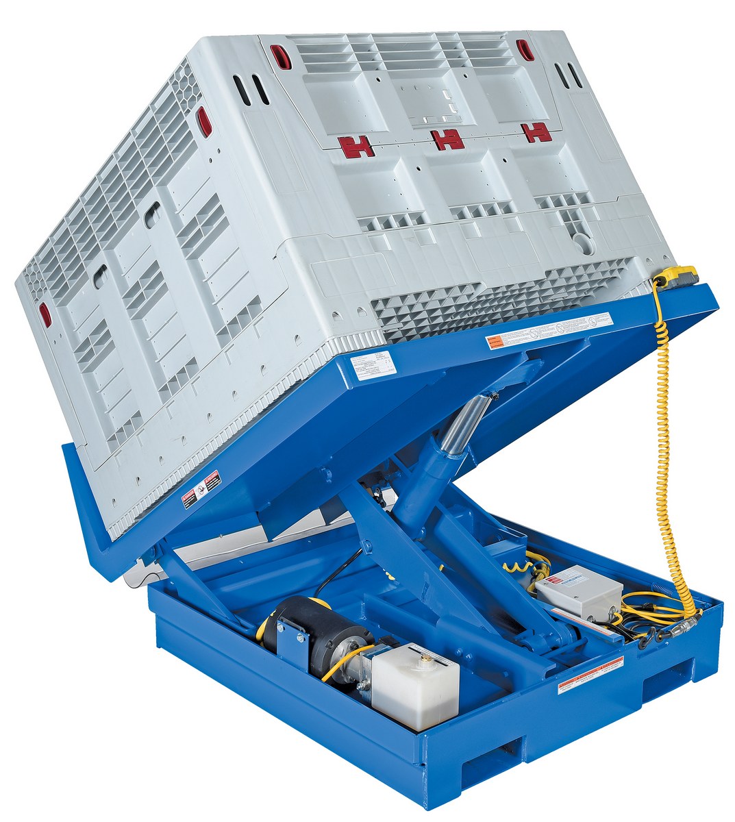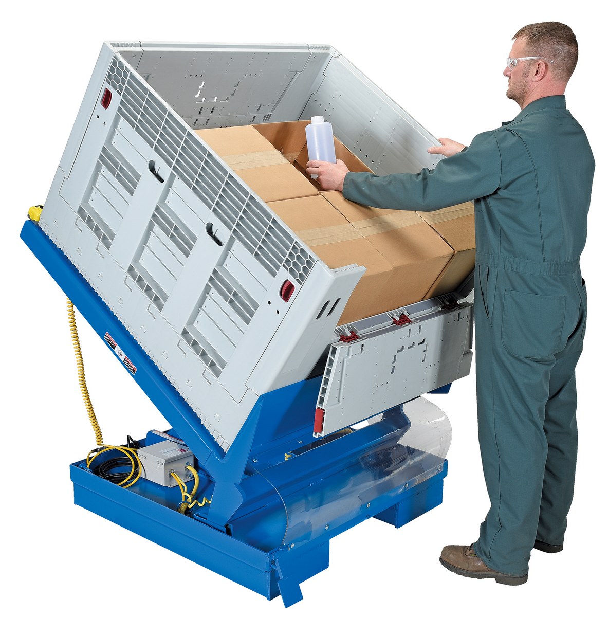 The portable Uni-Tilt can transport your tilter from workstation to workstation quickly and easily with a fork truck. Usable fork pockets 2-1/2"H x 7-1/2"W with 24" fork centers. The unique design reduces fatigue by minimizing repetitive bending and stretching required to obtain components from containers. The platform has a high lip the tilt side and a selector pedal that allows the operator to lift while tilting or tilt then lift. The unit has a hand pendant control standard and optional voltages available.