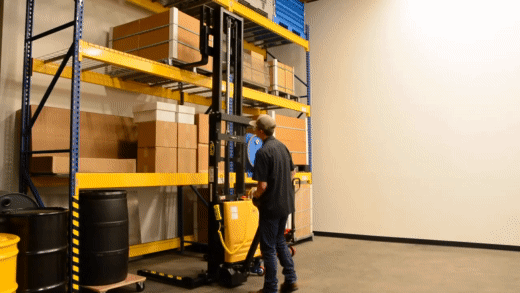 Double Mast Fully Powered Electric Stacker transports loads throughout warehouse facilities quickly and with less effort. High torque 24VDC drive and lift motor handles heavy-duty jobs. Ergonomic handle features easy-to-operate throttle with infinite adjustment of forward and reverse speeds, lift/lower controls, proprietary safety-enhancing emergency reverse function, and horn. Includes an electromagnetic disc brake with automatic dead-man feature that activates when user releases the handle. Powered lifter has two 12V lead acid deep cycle batteries, integral battery charger, and battery level gauge. Stacker rolls smoothly on poly-on-steel steer and load wheels. Feature 1.0 KW drive and 2.0 KW lift motor. 3-4 hour operation at full charge - 8 hours when used intermittently.