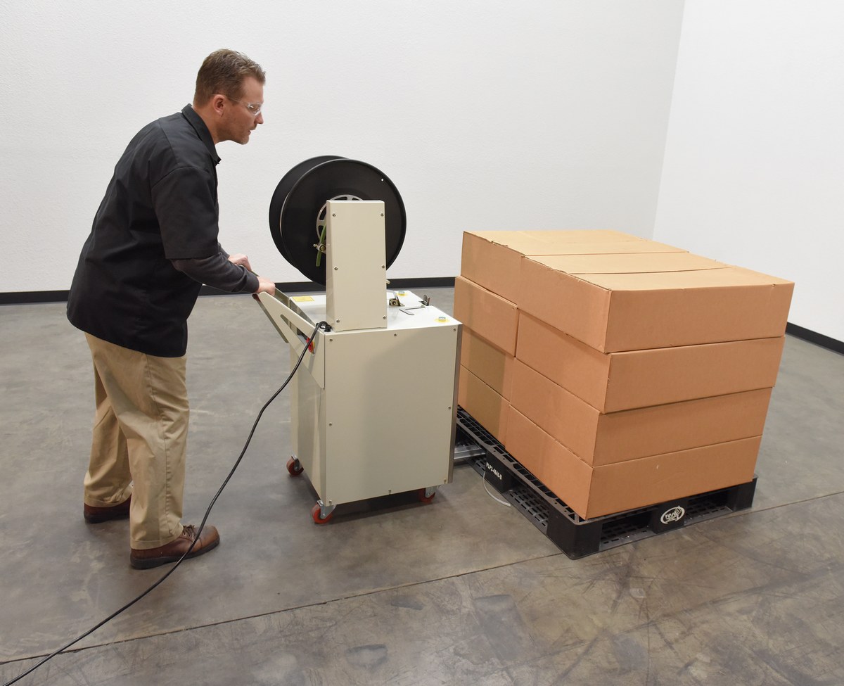Eliminate hand strapping and speed up the process of pallet strapping with this Semi-Automatic Pallet Strapper. Unit automatically feeds the desired polypropylene strap through the pallet, tightens and seals the strap around the pallet. 115V power supply.