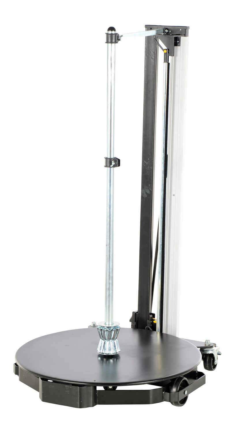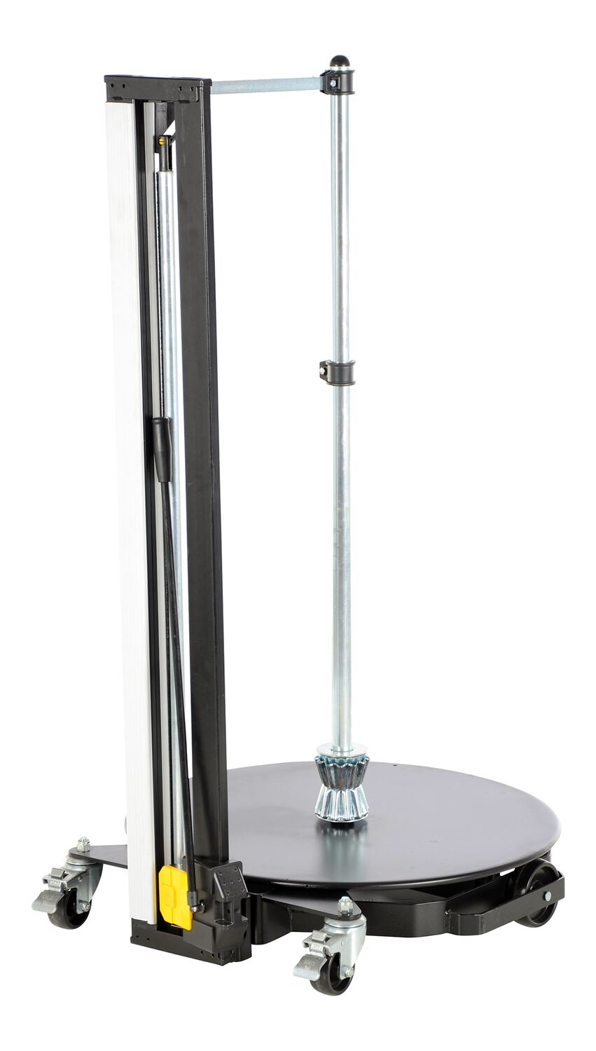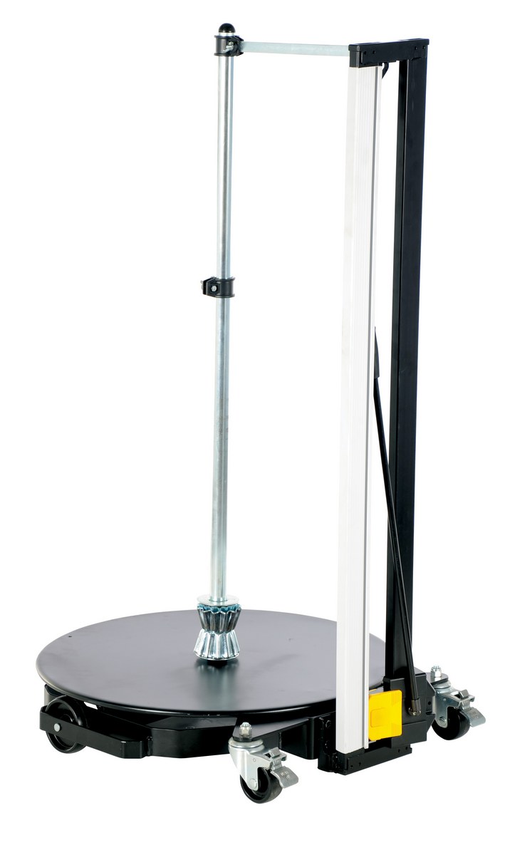 The unique portable Roll Dolly is designed for moving, holding, and dispensing rolls of material right where they are needed. Integral turntable easily rotates on ball bearings to allow for dispensing. Upright post detaches to allow for easy loading of larger rolls. Unit rolls smoothly on (4) four swivel total locking 3" x 1-1/4" polyurethane casters. Steel construction with powder coat finish. The Dolly includes integral cutting blade for quick and easy cutting of materials.