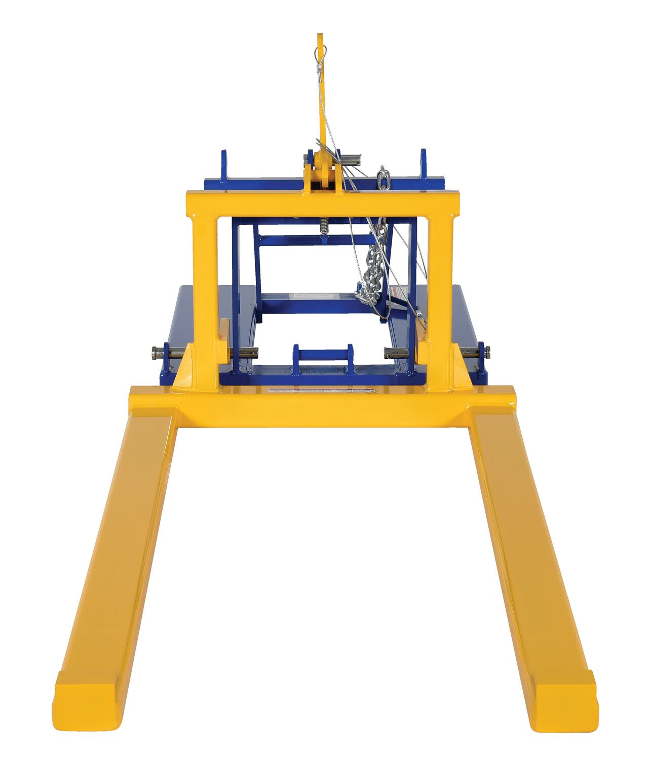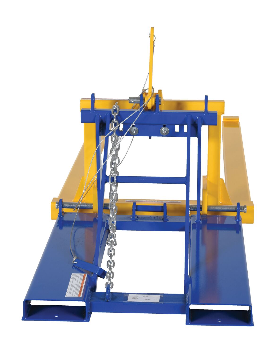 Dump loaded pallets easily without leaving the seat of your fork truck with the all welded steel constructed Pallet Dumper. Unit fits to forks and is secured by a safety chain. Two retainers hold the pallet in place while dumping the contents into the hopper or dumpster. Once the retainers have cleared the opposite end of the pallet, raise the forks and the retainers will hold the pallet on the forks. Lift the pallet to the dumping height and rest the pallet on the edge of the dumpster. Pull the cable, releasing the fork carriage, allowing the pallet to tilt and dump the load into the hopper or dumpster. When finished, simply lower until the carriage latches.
