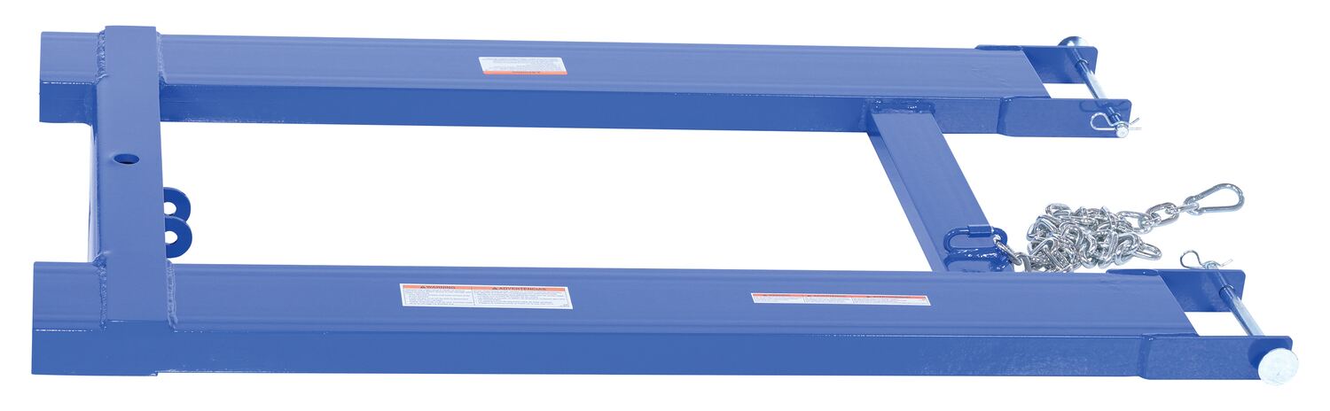 Convert your fork truck into a tow truck for moving trailers and other portable equipment. Simple design slides onto forks and secures into place with pin style tine locks and a safety restraint. Welded steel construction with blue baked-in powder-coat finish for added toughness. 5"W x 2"H usable fork pockets. Optional pintle hook, tow balls, fifth wheel trailer spotter, lifting hooks and hitch available. Bolt on design. Never exceed the 4,000 lb. capacity of the hook base. An attachment does not increase the total capacity of the unit.