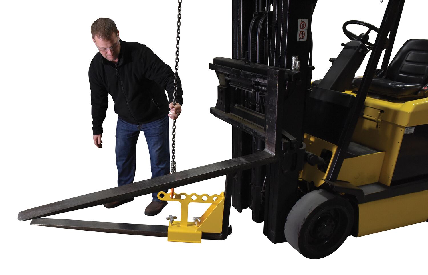 Manually lifting and carrying individual forklift forks used to be demanding, dangerous, and labor intensive. Now, thanks to Vestil's continuous ingenuity, work in the manufacturing, farm, and freight industries just got easier! This fork lifter is specifically designed to assist in removing forks from the forklift carriage. To use, simply slide the lifter over the body of the fork until it reaches the desired position and then tighten the two security knobs to prevent the lifter from moving further down the fork. The lifter is now ready to be attached to your lifting equipment by utilizing one of the six hook points!