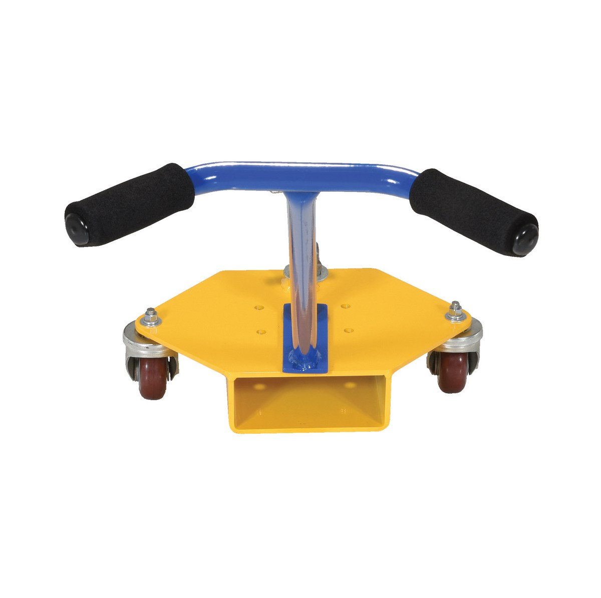 After transporting the fork to the forklift, rotate the handle 90 degrees then slide the fork onto the mast. The Fork Caddy has easy-grip handles and rolls smoothly on two swivel casters. A star knob secures the caddy onto the fork to keep it in place while transporting. The comfort-grip handle pivots up to 180 degrees to allow for easier mobility. The Fork Caddy is lightweight and small enough for easy storage as well.