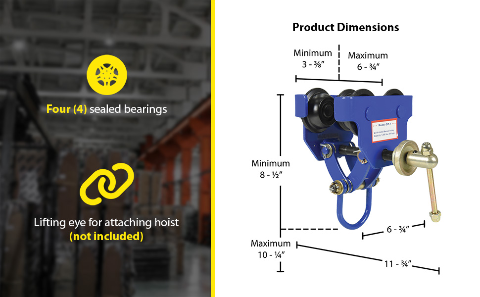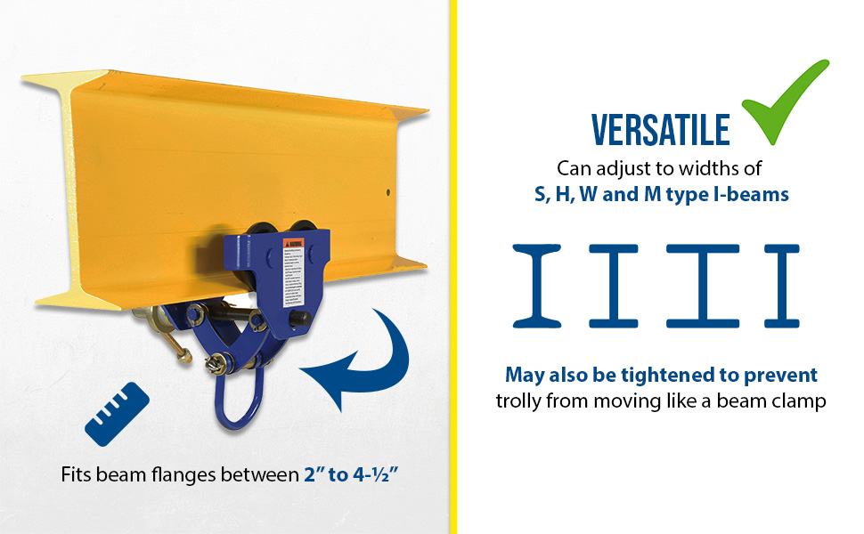 QIT-06These trollies are dependable, easy and safe to use. Designed to easily adjust to the width of virtually any S, H, W and M type I-beam. Width is adjusted with manual screw mechanism. Includes locking ring to prevent trolley width from changing accidentally. Manual screw mechanism may also be tightened to prevent trolley from moving (similar to a Beam Clamp). Each trolley includes four rollers with sealed bearings for long life. A lifting eye is located at the bottom of the trolley for attaching to a hoist (hoist sold separately). Steel construction and painted finish.