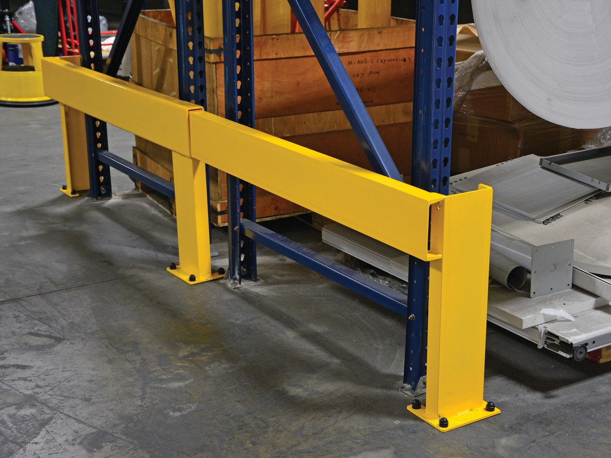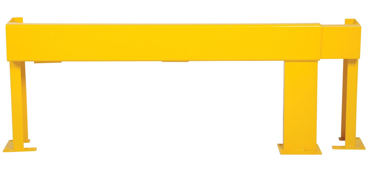 Protect the row ends of tandem pallet racking with this heavy-duty, welded steel adjustable rack guard. Slide in design has a variable length range of 62" to 108". Includes steel mounting plates with (10) 7/8" diameter holes to safely secure unit to floor. Powder coated with safety yellow finish.