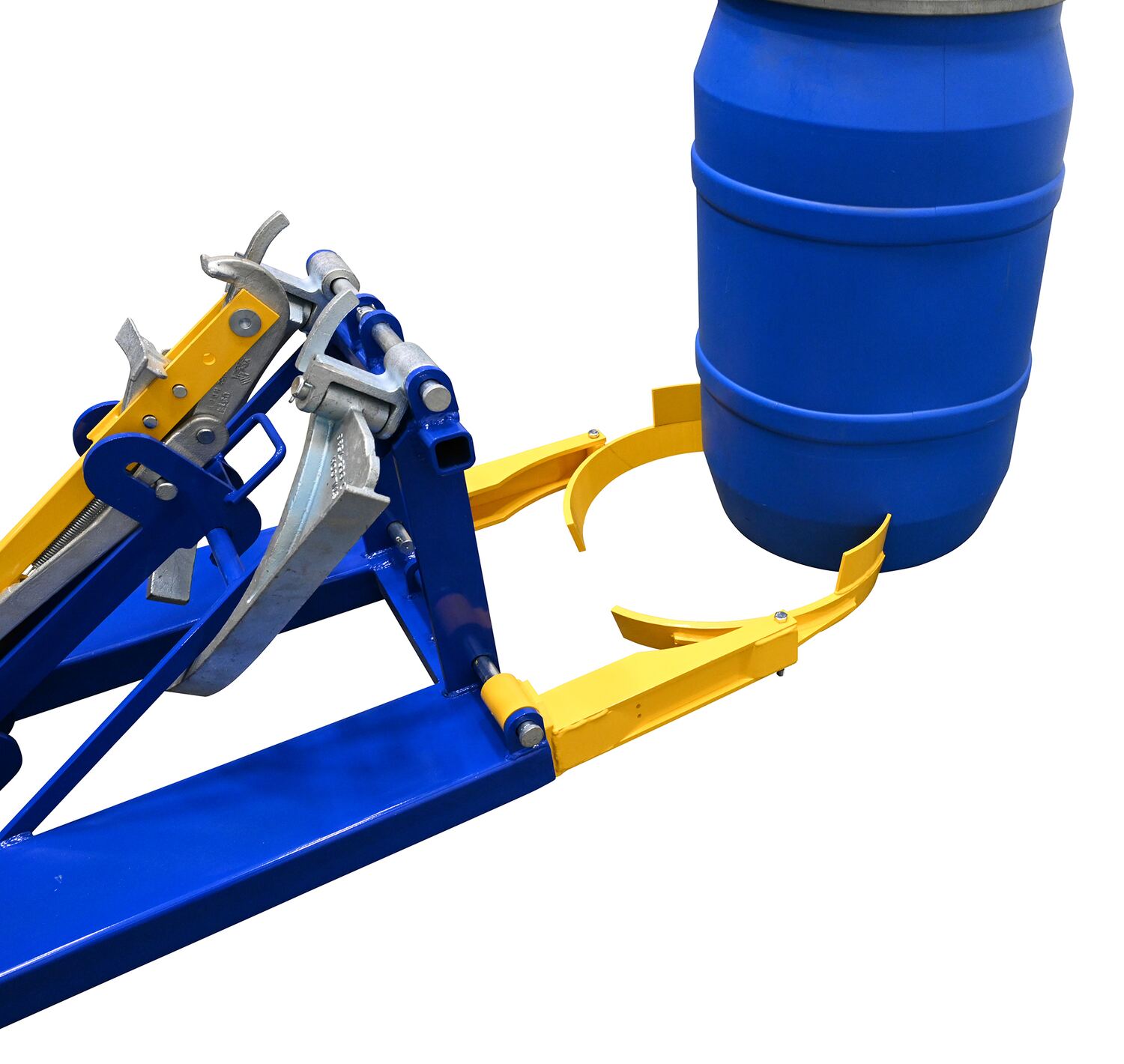 DFDL-3 360Deluxe Combination Fork Mounted Drum Lifter includes attachments to lift any type of drum; 30 and 55-gallon, steel, plastic, fiber, and open or closed head drums. Includes single Eagle Beak unit and both bottom and top lip Poly Drum Lifters. Uniform capacity will vary depending on which attachment you use. The usable fork pockets are 7-1/2" wde by 2-1/2" high on 20-1/2" centers. Includes safety restraint for securing unit to fork truck. Welded steel construction. Powder coat finish. A ratchet strap is supplied to secure the drum to the unit when traveling over rough terrain.