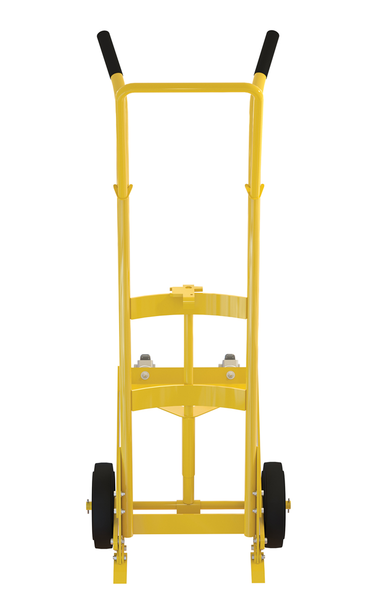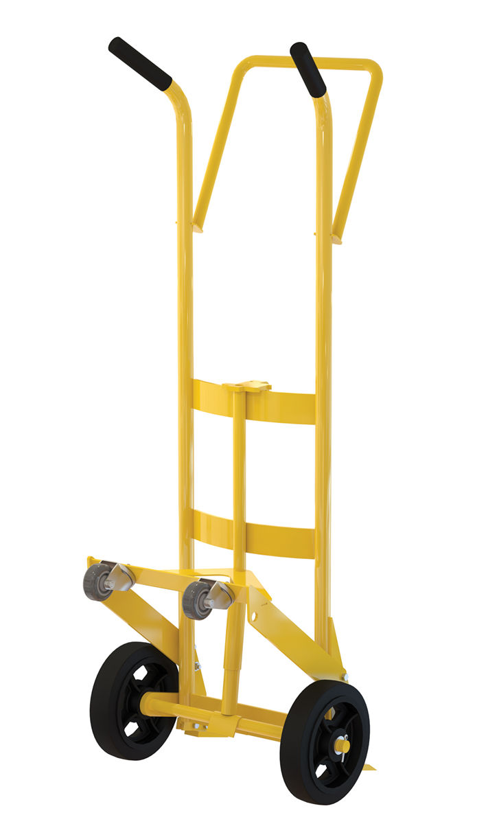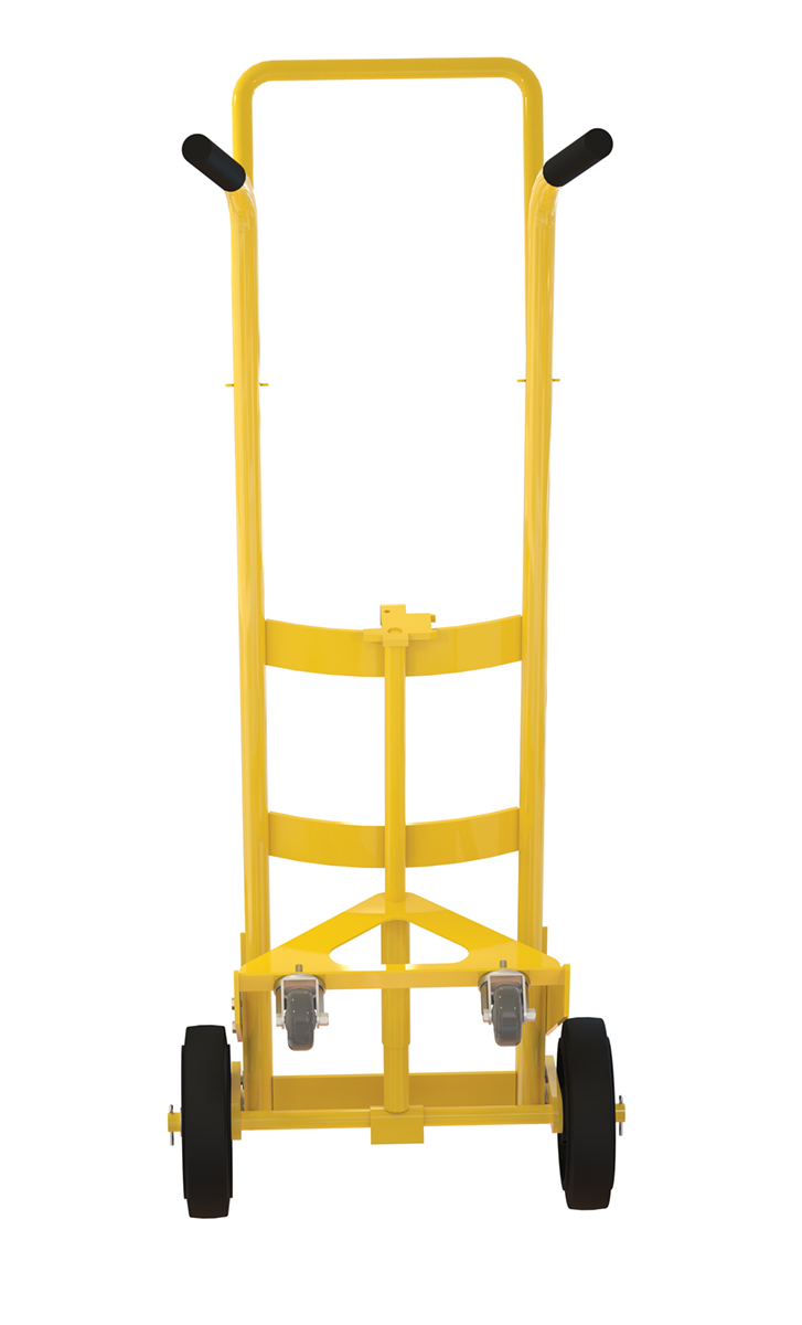 Designed for moving 55 gallon steel or plastic drums. Features a spring mechanism, which allows for easier tilting of fully-loaded drums. Four-wheel design for easier drum transportation when tilted. Top loop handle allows for easier control when moving. Drum is secured to truck with an adjustable height drum hook bar. Removable drum hook bar includes built-in bung nut wrenches. Capacity is 1,000 pounds. Steel construction with powder coat finish.