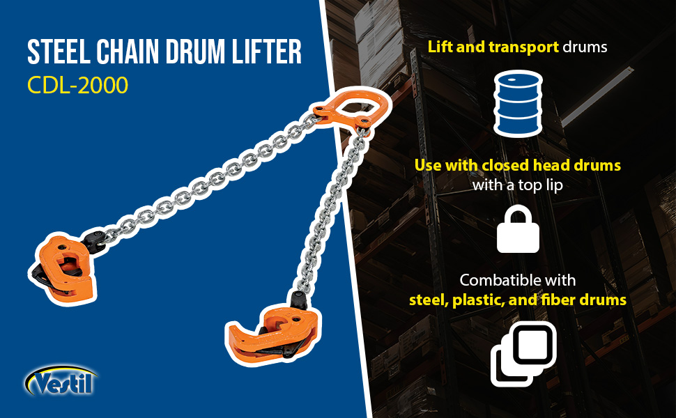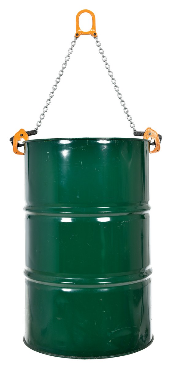 Designed for easy drum lifting and transporting operations with an overhead lifting device. Constructed of grade 80 chain for OSHA & ANSI compliance. Easy to use design. Drum clamps include spring-loaded latch for positive drum grip. For use with closed head steel and plastic 30 and 55 gallon drums with a top lip.