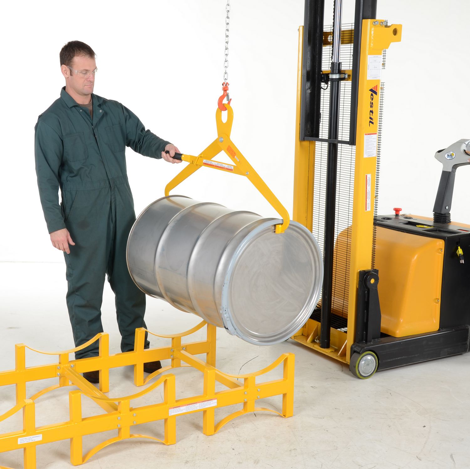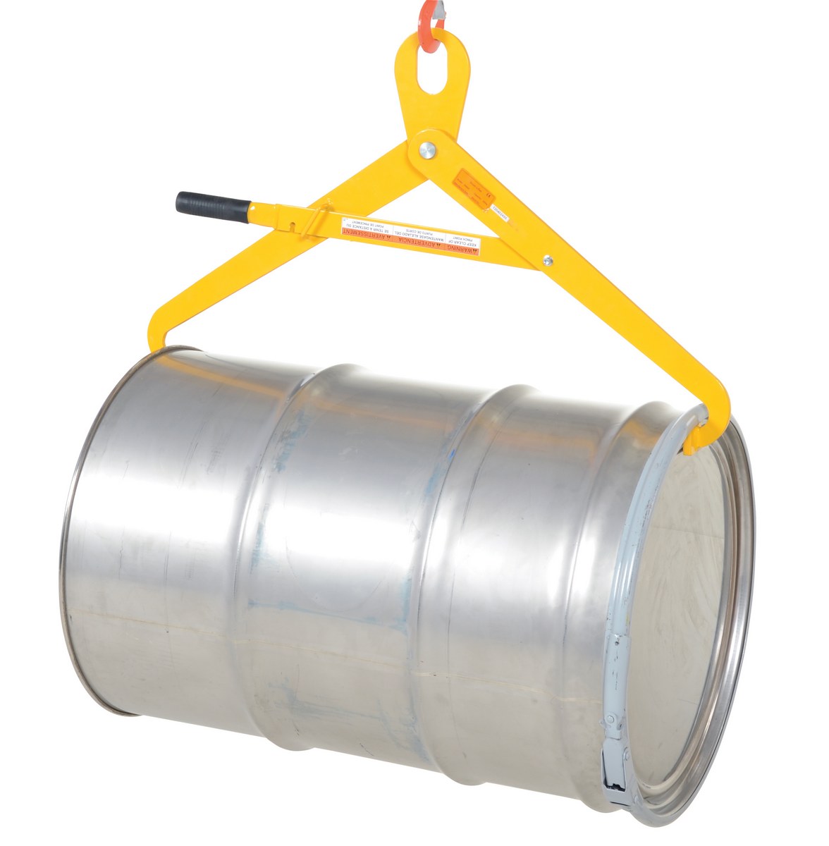 Made to lift 55 gallon steel or fiber drums with an overhead hoist. Suitable for open top or tight head steel drum which have a ring. To operate set locking lever in locked open position. When central over the horizontal drum release lever to allow hooks to fall and locate under both rims. Hook automatically engage as it is lifted and disengage as drum is set down.