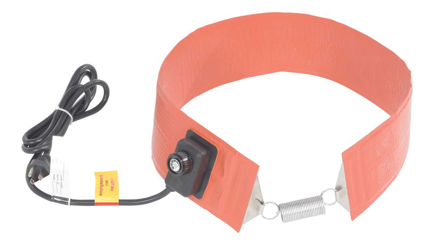 Quickly and efficiently heat-up your steel drums or pails. Easily adjust thermostat set-point: 50 to 425 degrees Fahenheit for steel drums and 50 to 160 degrees Fahrenheit on poly drums. This extra-wide 4" silicone rubber band heater is moisture and chemical resistant. Multi-stranded grounded heating element provides uniform heat and a long service life. Spring closure can be expanded 3". Unit comes with a 6-foot-long power cord, grounded 3-prong. The -CA suffix indicates models that are CSA approved for use in Canada only. Feature a 6 foot long power cord with no plug. The use of multiple heaters may reduce heat stratification of the material being heated.