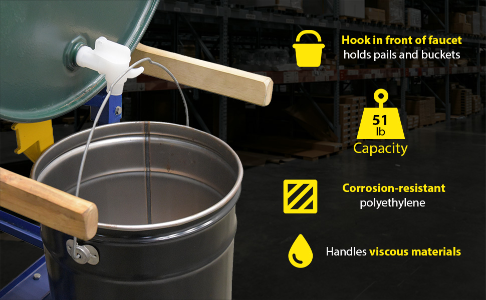 Polyethylene Drum Faucet, model VDFT, is constructed of corrosion-resistant polyethylene. Handles viscous materials. Instant on/off control ensures fast, smooth flow. Padlock not included. Integral hook allows users to hang pail on faucet (51 pounds).