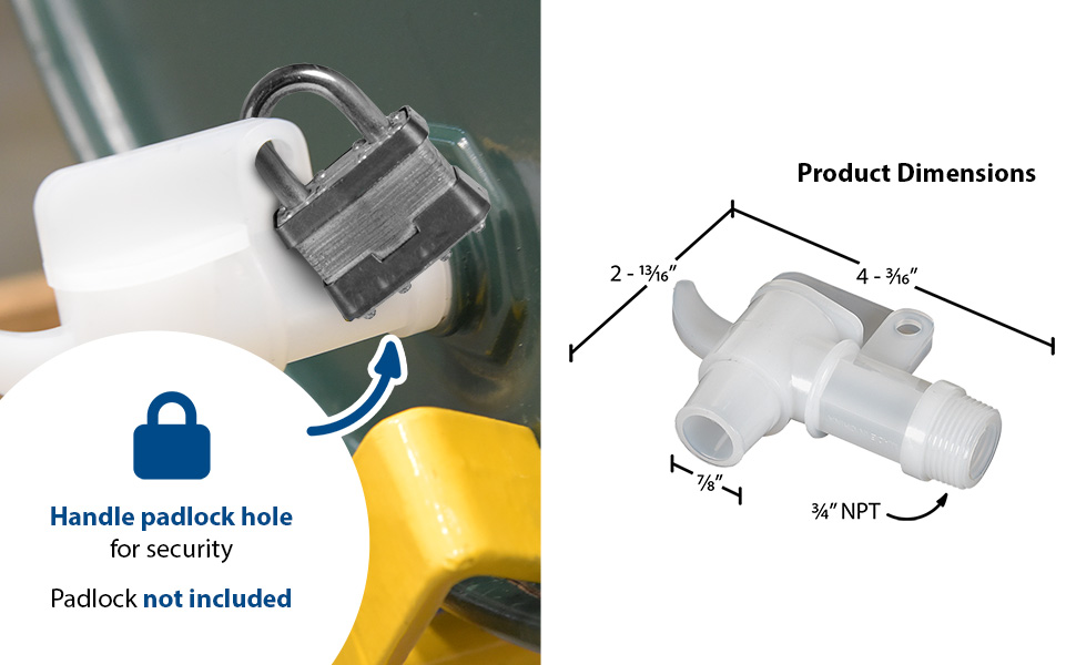 The Jumbo Drum Faucets, model JDFT, are ideal for dispensing viscous, non-corrosive flammables such as adhesives, paint, heavy oils, grease, and varnish. Padlock not included. Integral hook allows users to hang pail on faucet (51 pounds).