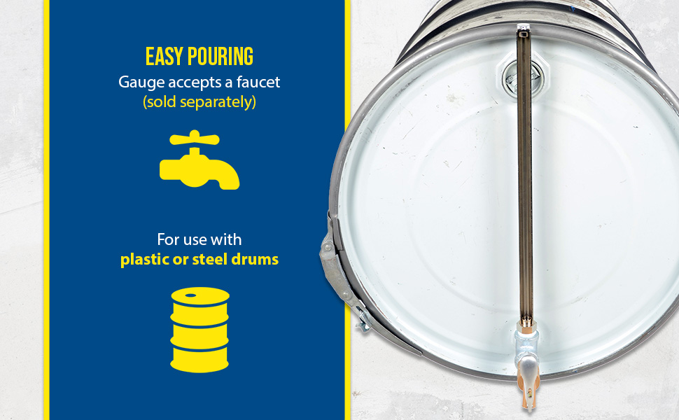 The DGLI-4 allows personnel to read the level of contents in a drum. Accommodates 3/4" faucet. 18-3/8" site gauge. For use with plastic or steel drums. Works well with most oils, solvents, and chemicals. Faucets sold seperately.