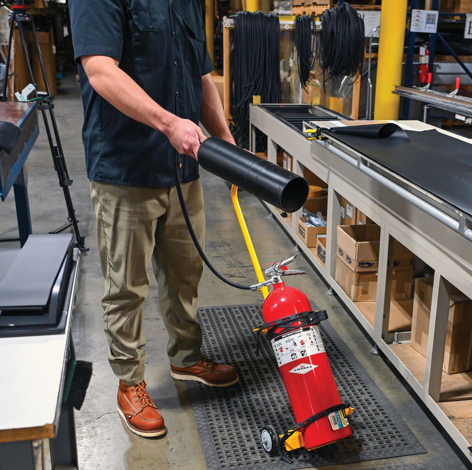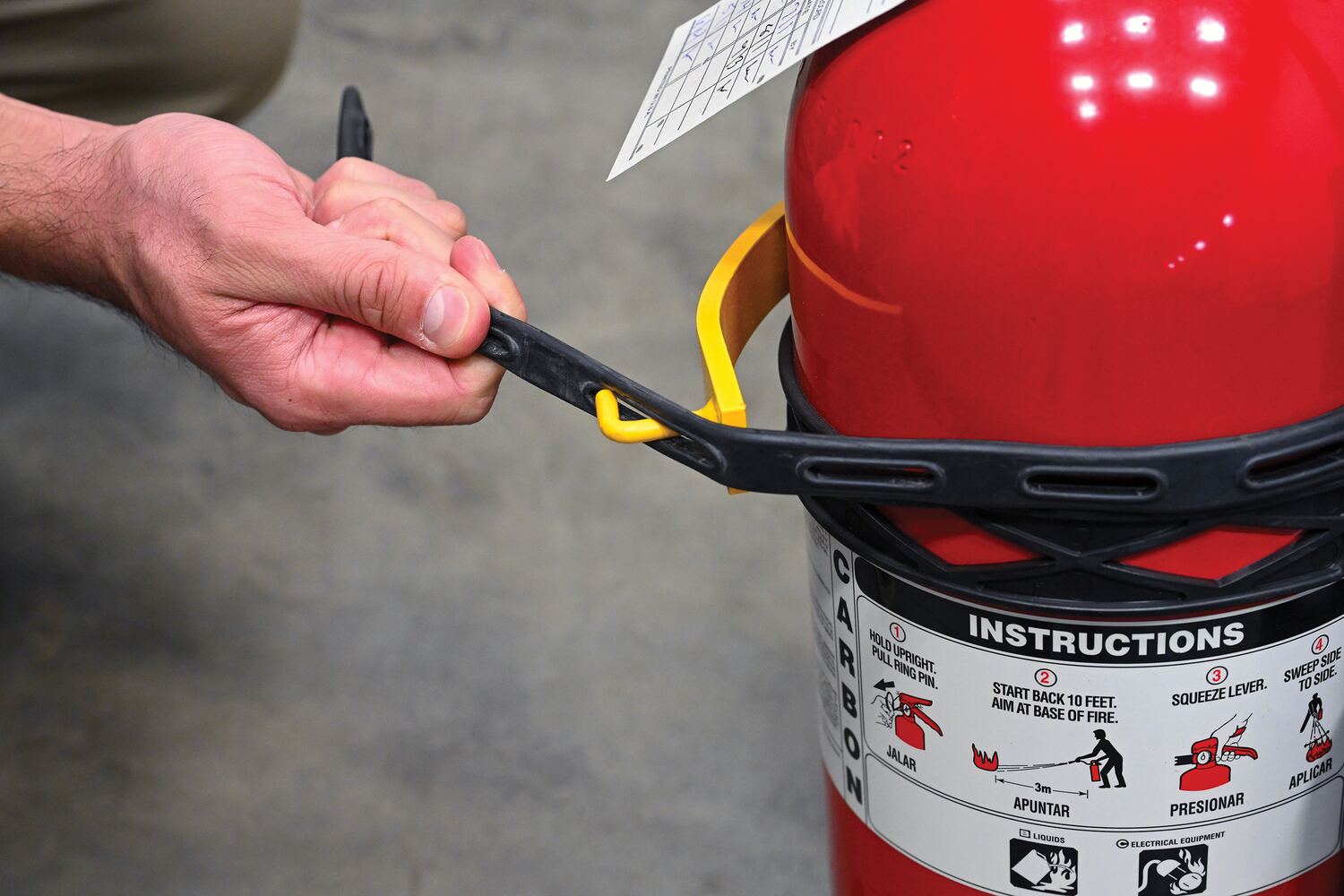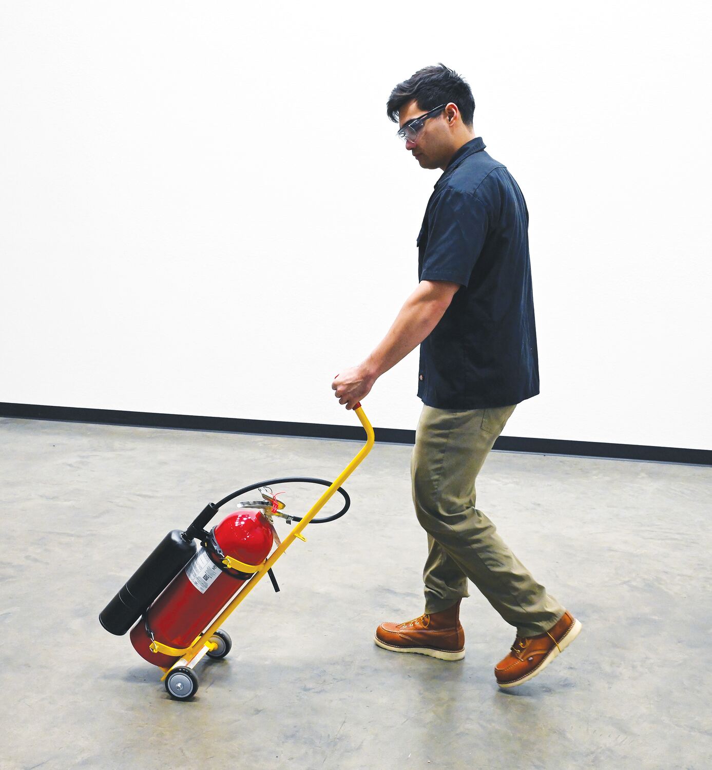 The Fire Extinguisher Carrier, model FEC-1, is designed for easily transporting your fire extinguisher up to 8" in diameter. Includes two (2) heavy duty adjustable rubber straps. Sturdy handle with rubber grip and poly casters for tilt-n-go portability. Welded steel construction with yellow baked-in powder-coat toughness. 4" x 2" stabilizing plate keeps unit upright when empty and helps retain extinguisher. Adjustable EPDM restraining straps keep extinguisher secure and allow for quick access. Wall mount bracket included to store the extinguisher off the floor.