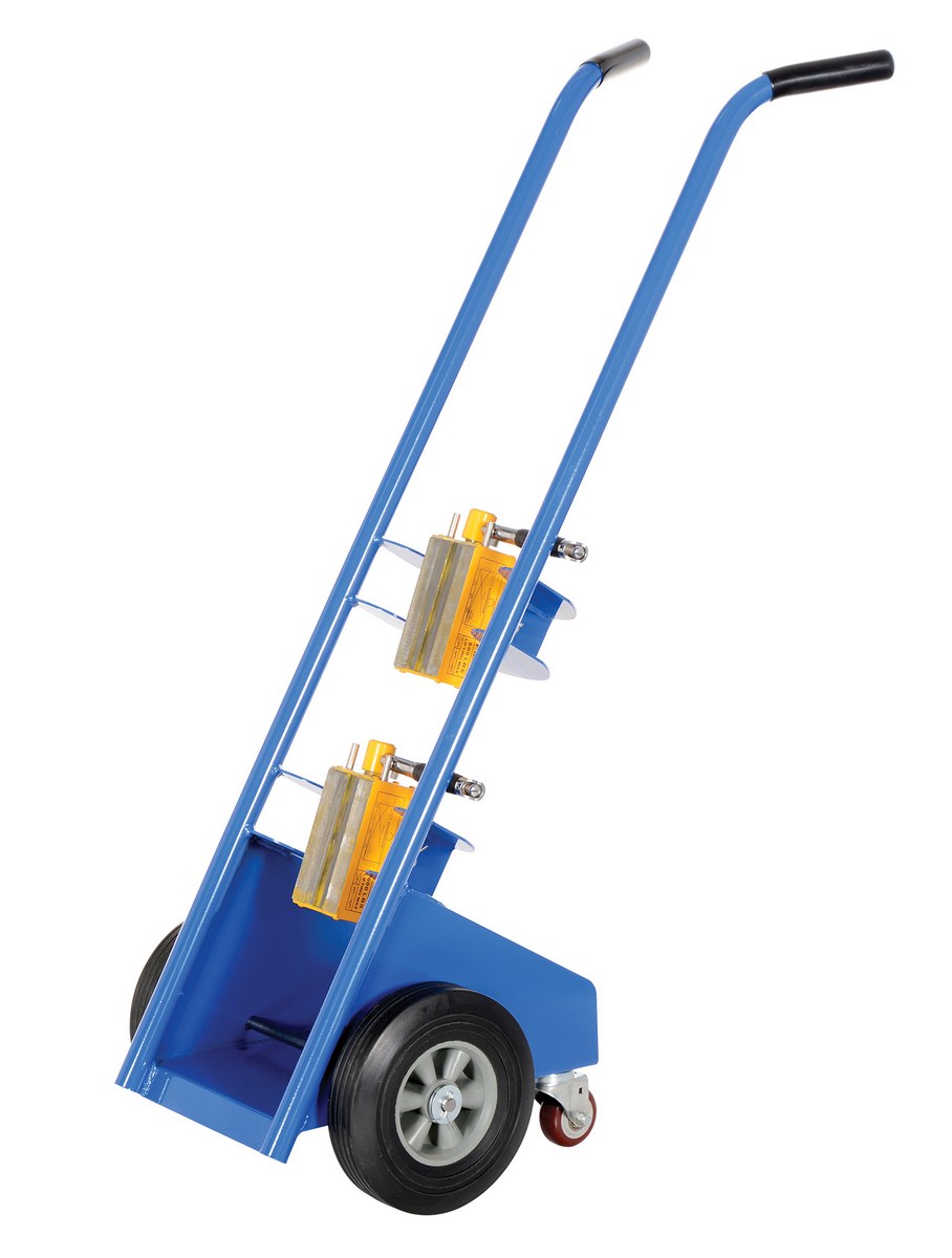 Designed and built to transport gas cylinders with ease, this hand truck uses strong magnets to hold the tanks in place. Units rolls easily on two (2) 10" x 2-1/2" rubber tires and two (2) 3" x 1-1/4" swivel casters. The tilt back design allows for effortless transportation. Baked-in powder-coated toughness.