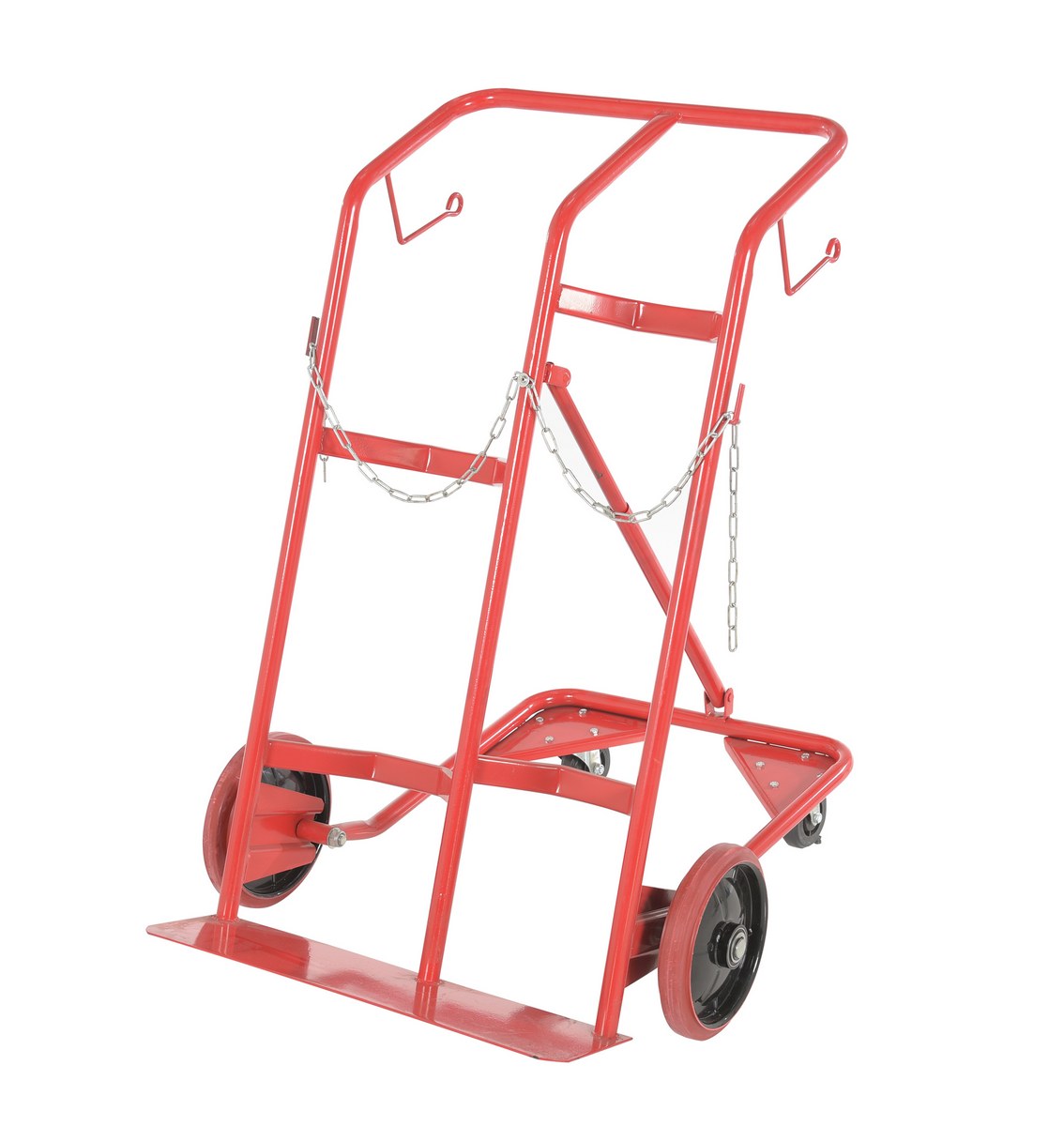 Ideal for transporting cylinders from storage to work space. Tilt back design for effortless transportation. Chains and contoured back cradle provide utmost safety. The two mounted chains measure 28" long. Unit rolls smoothly on two (2) 10" x 2" mold-on-rubber wheels and two (2) 4" x 1-3/8" phenolic casters.