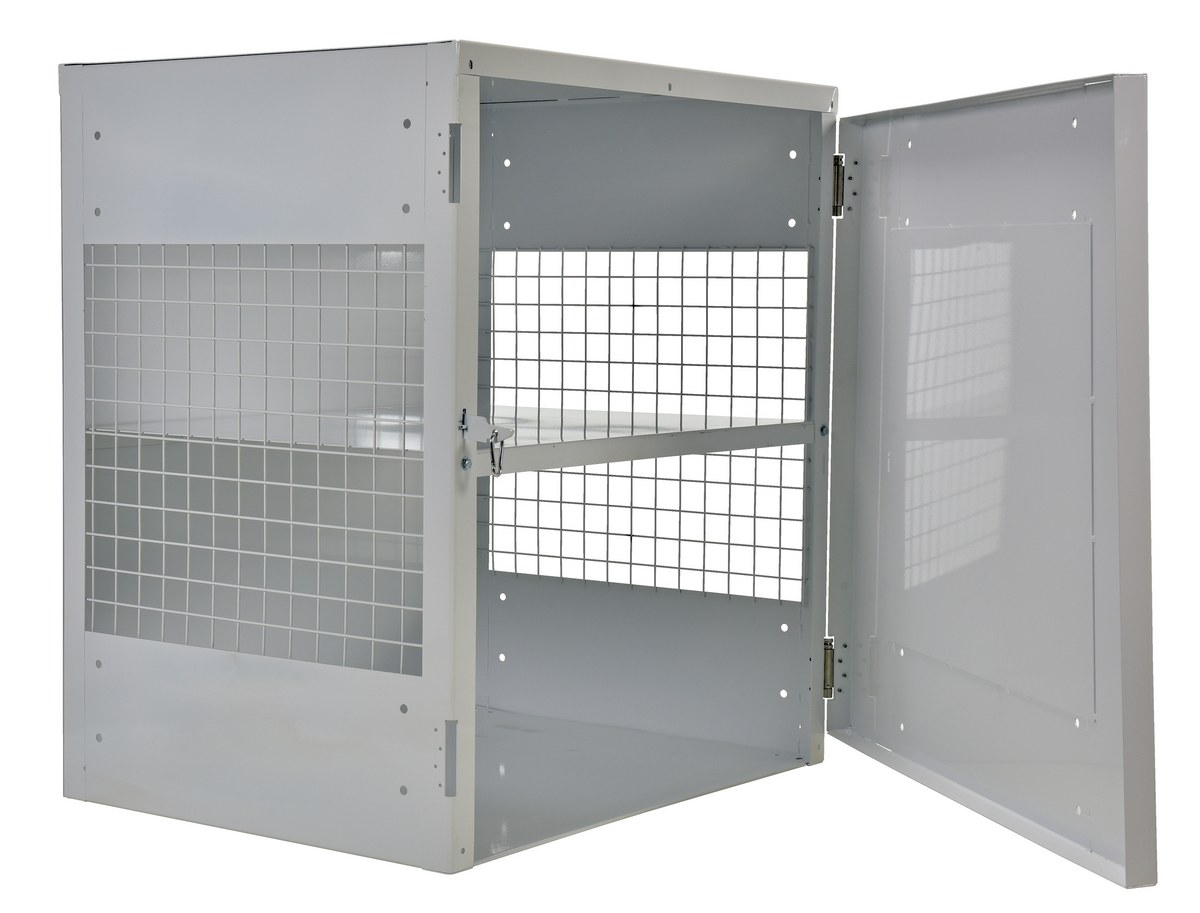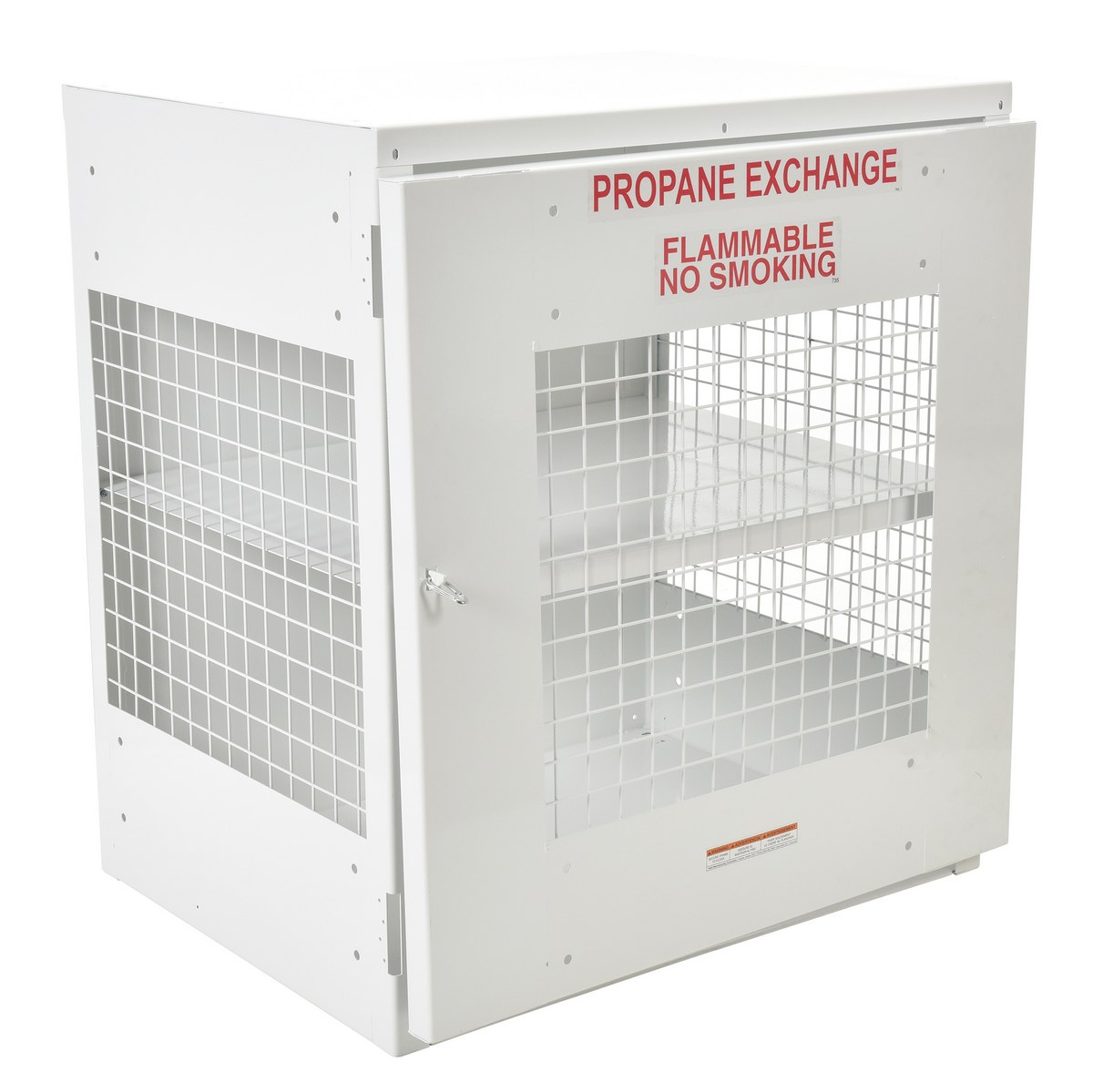 Durable steel cabinets for storage of standard 20# Propane gas cylinders. The sides are made of expanded steel, while the top, back, and bottom is made of solid sheet steel. The front door is available in expanded metal or solid steel panel. The lockable door protects the cylinders (padlock not included). The door features stainless-steel spring-loaded hinges. White baked-in powder-coated toughness. Includes red lettered signage noting "PROPANE EXCHANGE, FLAMMABLE, NO SMOKING."