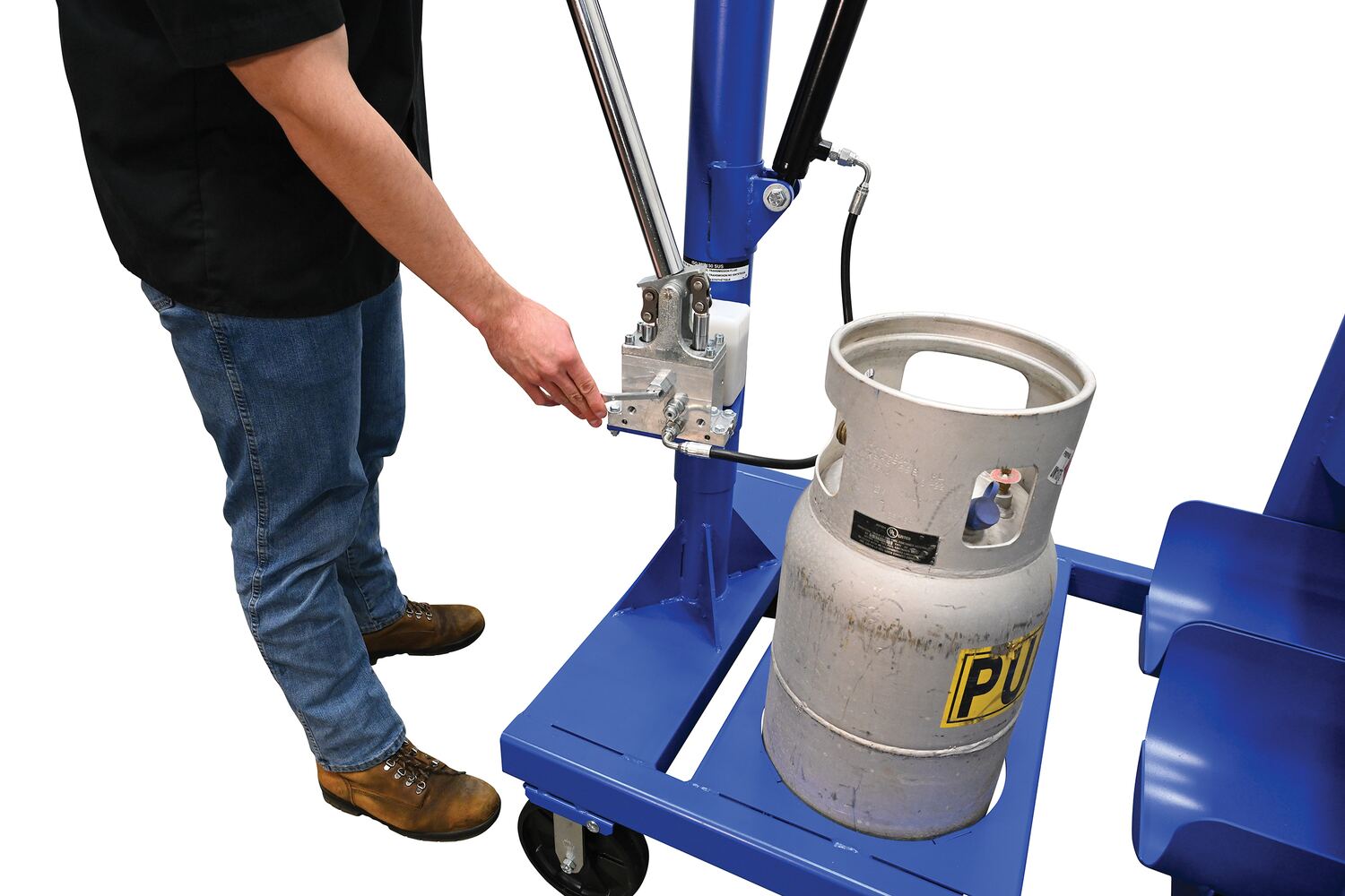 LP-6Finally an easy answer to lifting, storing, and transporting problems associated with LP tanks. The built-in crane can be used to safely load full tanks into fork trucks. The crane pivots 360 degrees for maximum versatility. The crane boom is raised and lowered with a manual hydraulic hand pump. The tank attachment at the end of the boom automatically clamps to each end of the cylinder. The built-in racks are ideal for LP tank storage-racks. Store two (2) tanks in the vertical position and four (4) tanks in the horizontal position. Unit includes a push handle with two (2) rigid and two (2) swivel with brake casters for portability. Welded steel construction with a painted finish.