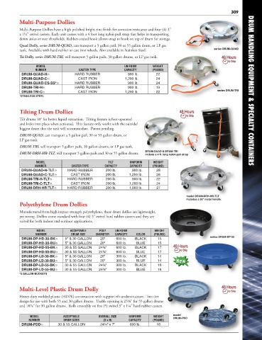 DRUM-DRH-HR-TLT, will transport 5 gallon pails and 30 or 55 gallon drums. DRUM-QUAD & DRUM-TRI