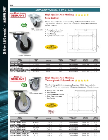 94 Shore A. Wheel core is constructed of impact resistant nylon. Made in Germany.